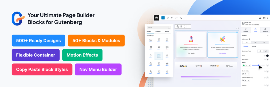 Even using its free version, you can launch a fully functional website with various customization options. For example, the draggable container is a noteworthy feature of GutenKit, which lets you create a unique structure for your website. With over 35+ pre-made blocks and 6 powerful modules, this block editor plugin boasts some other exceptional features: