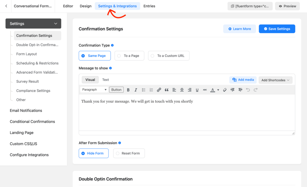 Settings: Under Settings, you’ll find confirmation settings where you can type your confirmation message along with where to show the message. With the double-optin, you’re forcing your users to confirm (the subscription) from their email. You can also display survey results with the confirmation message.