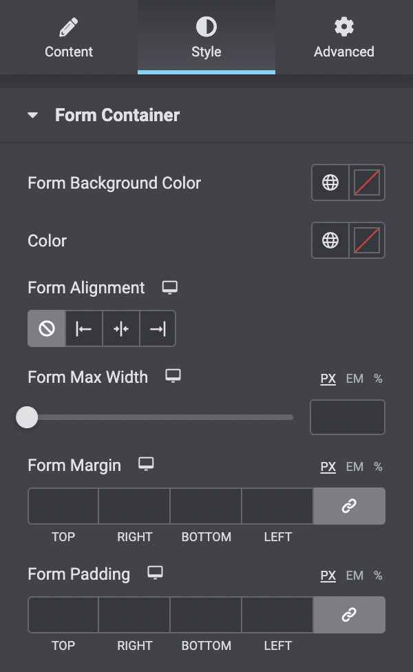 Set max-width, margin, padding, and radius to mold the form with your ideal shape. If you want to add a border, choose border type from five different styles. And, you will find all these options under Form Container.