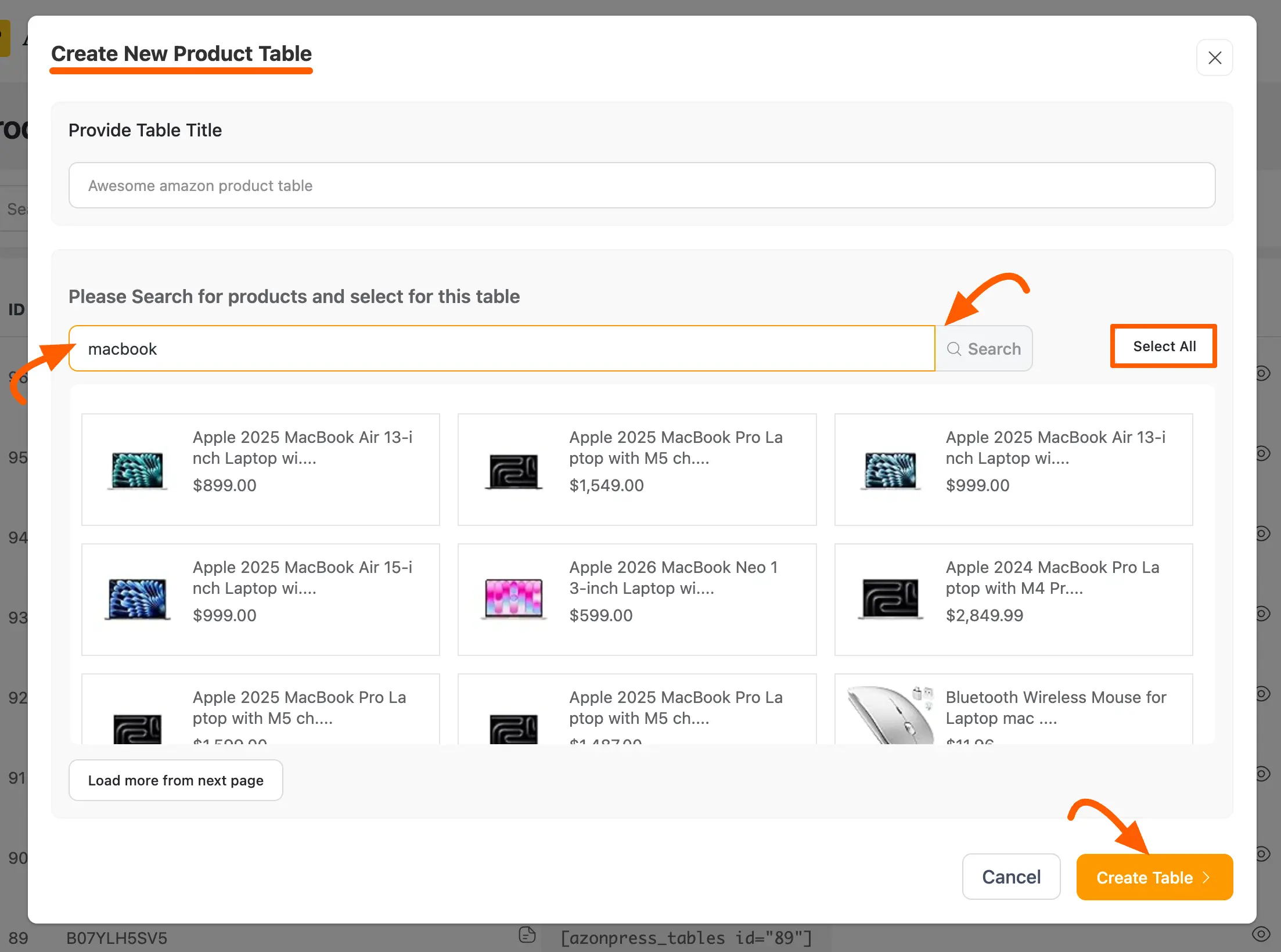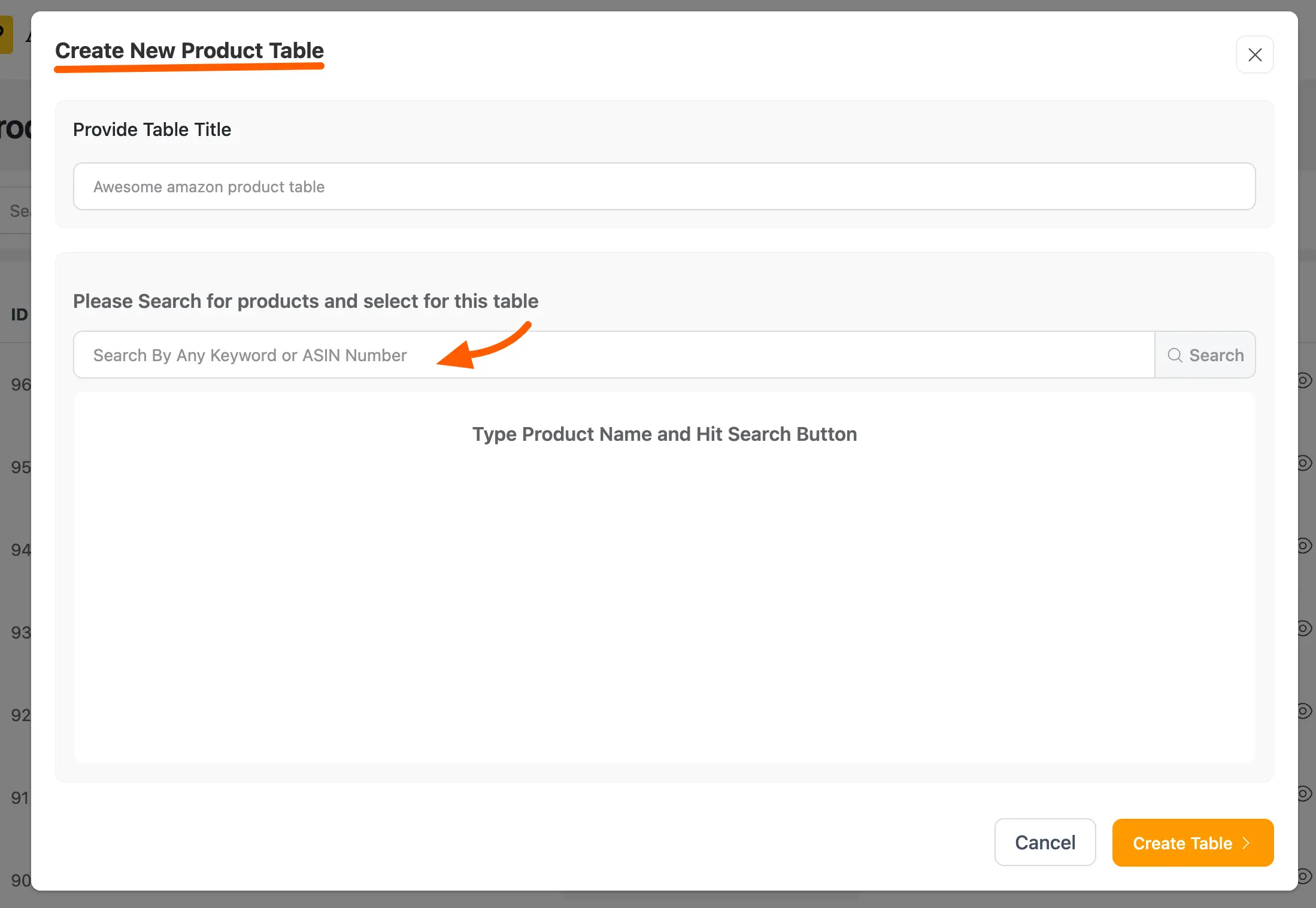 Give your table a Title. Now search for your desired products with keywords or ASIN Number and a list of products will appear on the window.