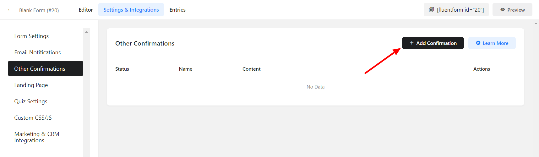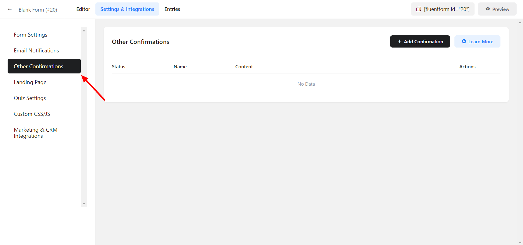 - Go to the Settings panel of the form in question and navigate to the Other Confirmations section.