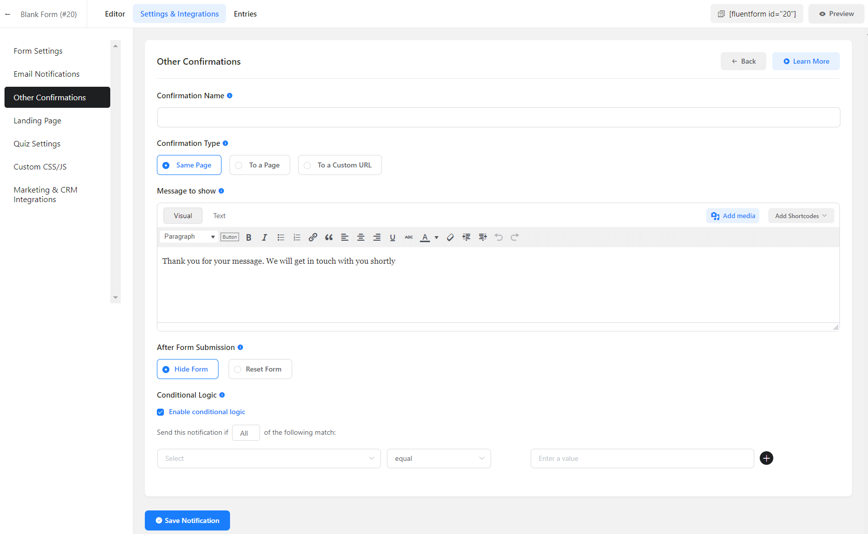 We have already enabled you to confirm submissions by users whenever someone fills up a form. But you might require to convey to users customized messages if they successfully comply with a certain logic or fail to achieve certain values while filling out forms.