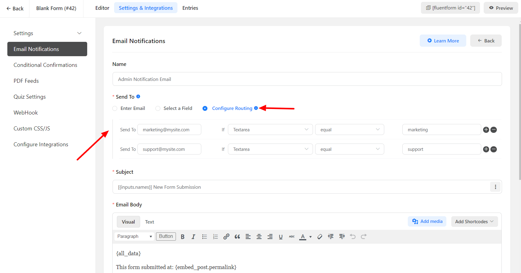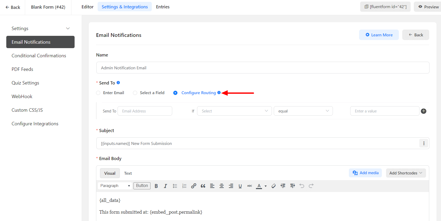 From Fluent Forms notification, you can configure additional email routing. This is similar to conditional email notification but Conditional Email Routing for different recipients based on the user input or different events. In this article, we will show you how to configure Conditional Email Routing within your notification.
