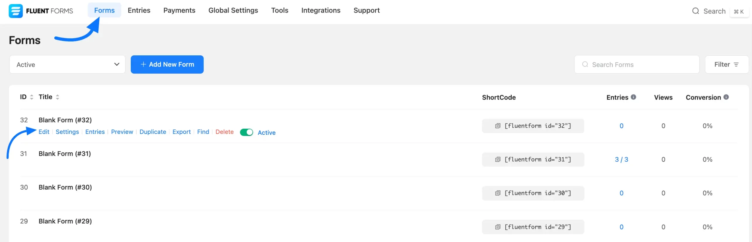 To get the Edit History feature, navigate to the Forms section in the Fluent Forms dashboard, then click on the Edit option for the form you wish to modify.