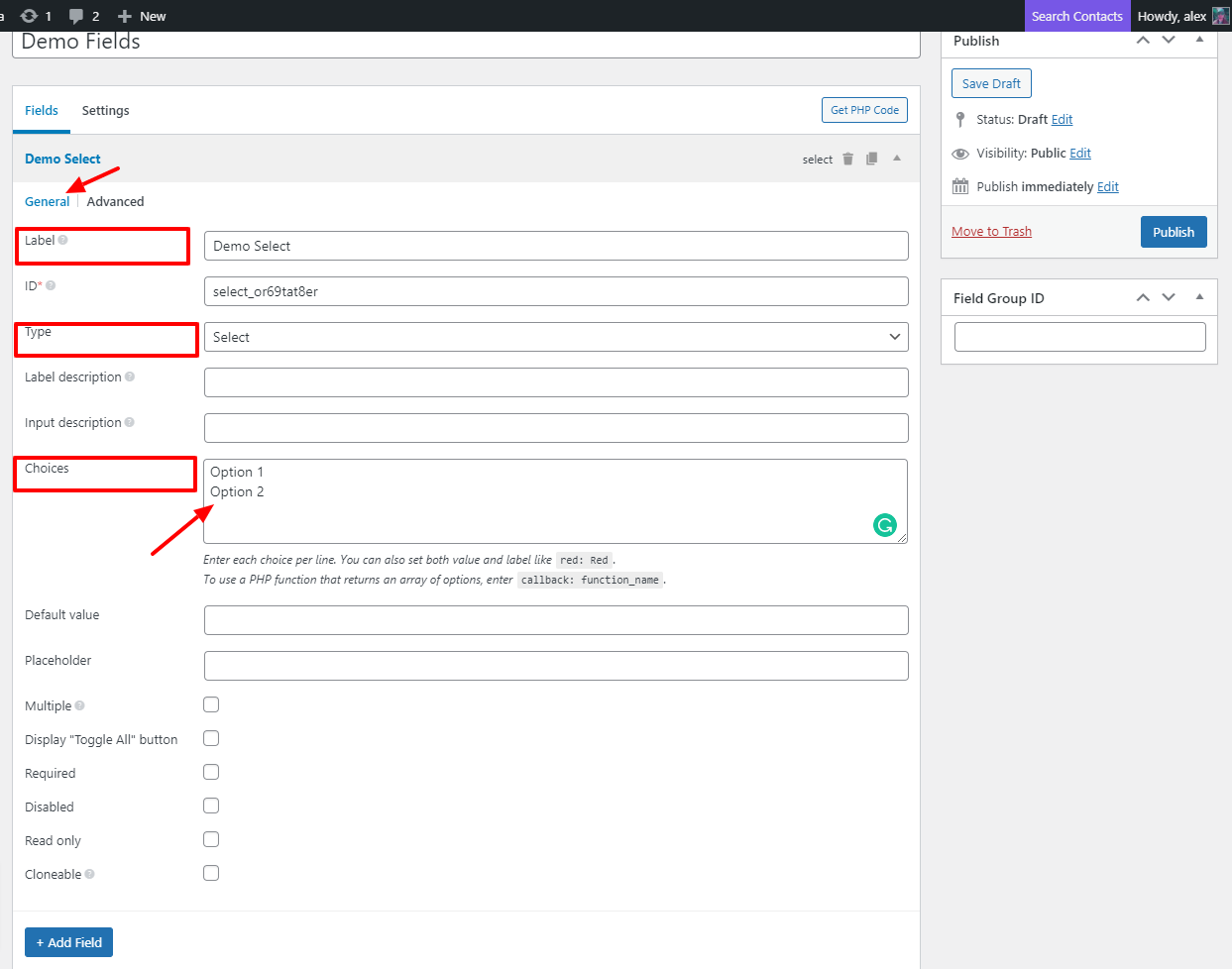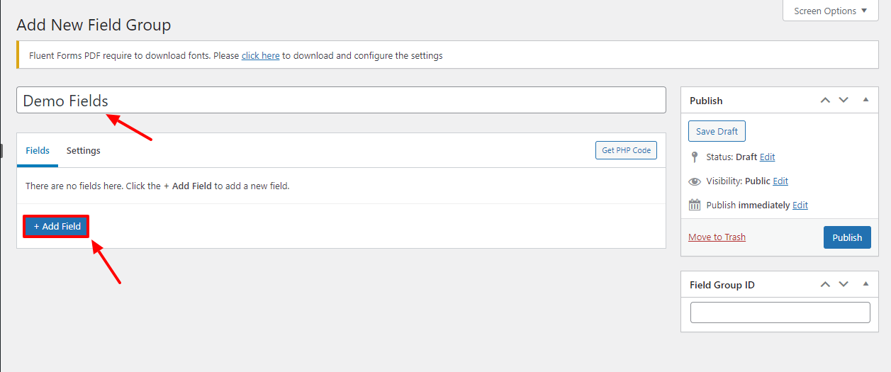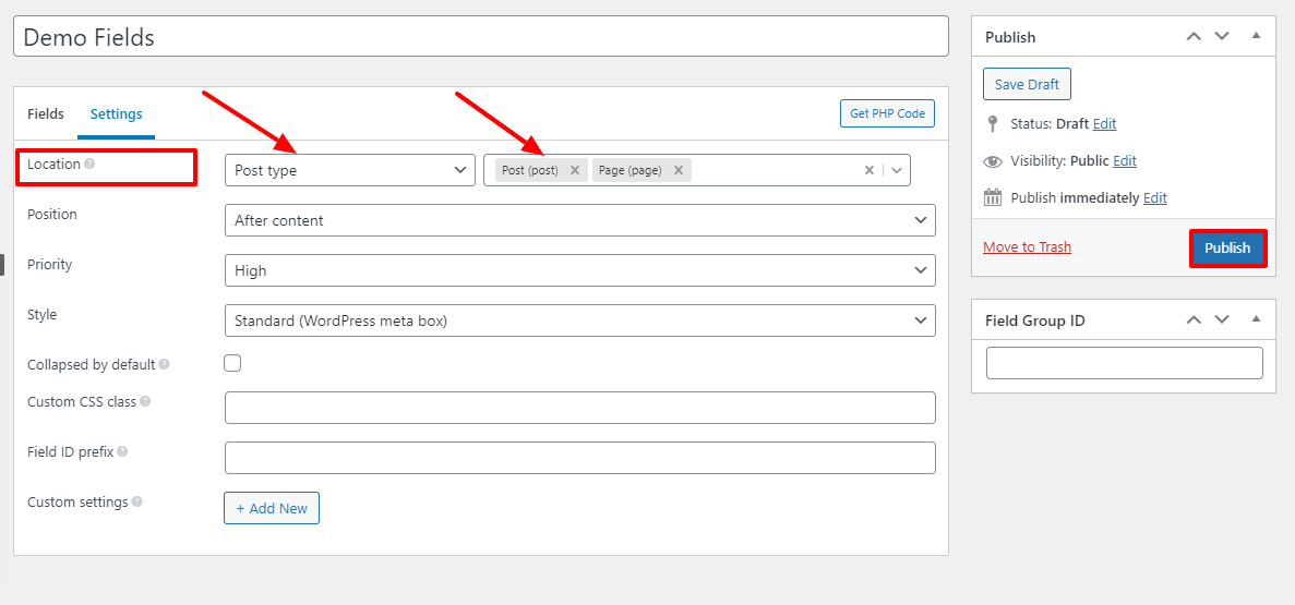 - You can give any name to the field group; in this example, it’s named Demo Fields.