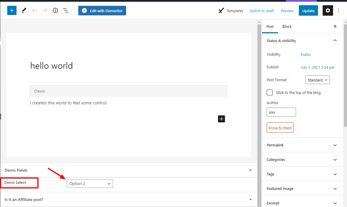 - You’ll notice the Metabox custom field on the Post page and the value at the bottom. This is how you can apply custom fields using Fluent Forms.