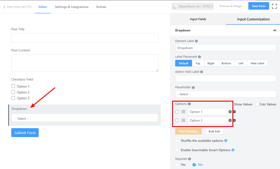 - Make sure you copy the Choices values from the custom fields & paste them into the Options section in the input customization option.