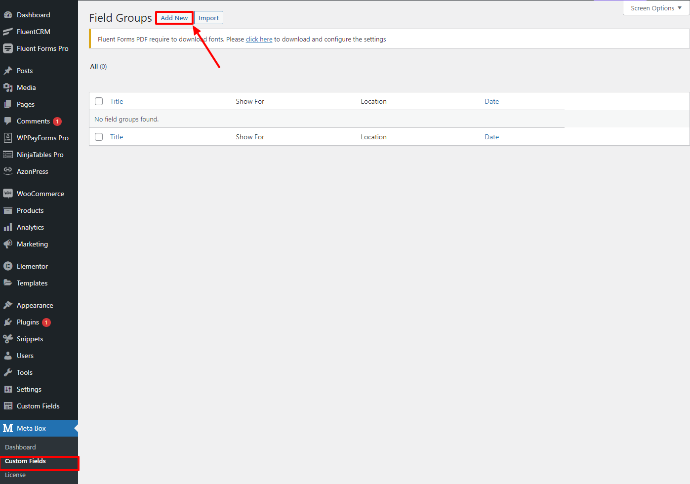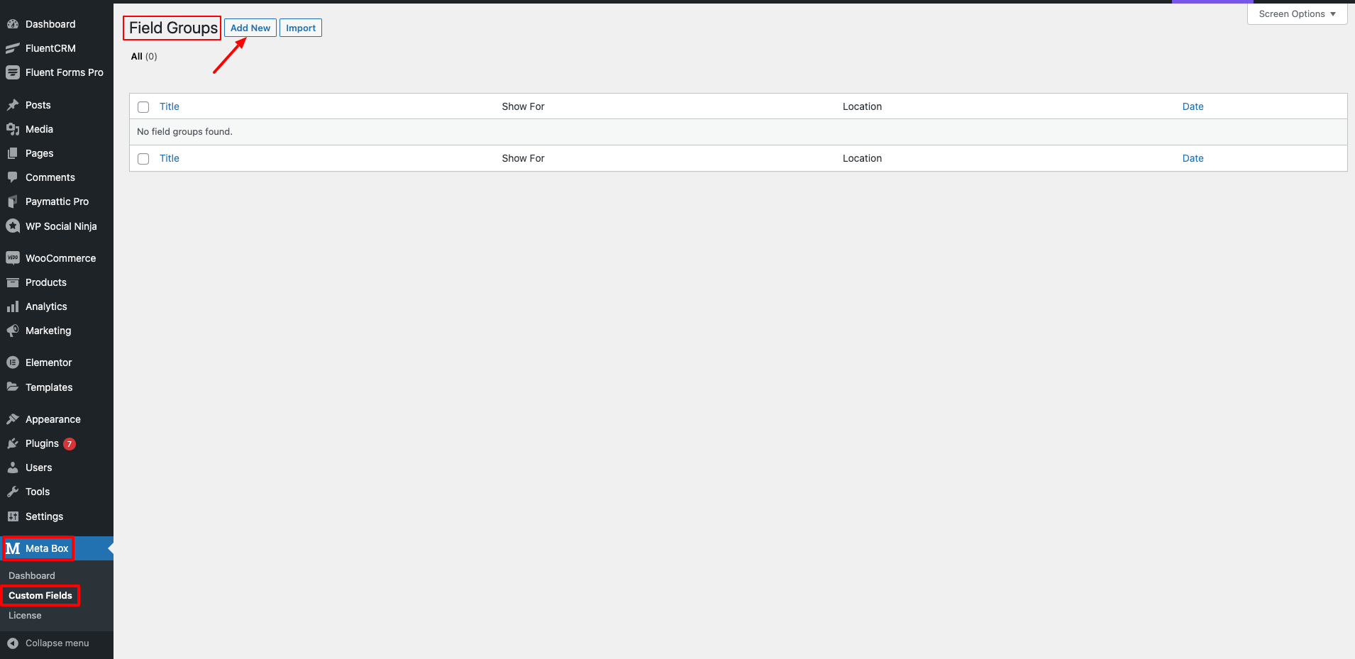 - To create a new Field Group, go to the plugin and click the Add New button.