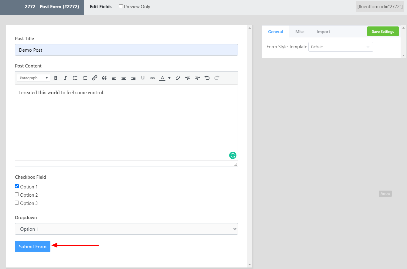 - After the field group is created, go to the Fluent Forms dashboard & select an existing Post Form or create a new one.