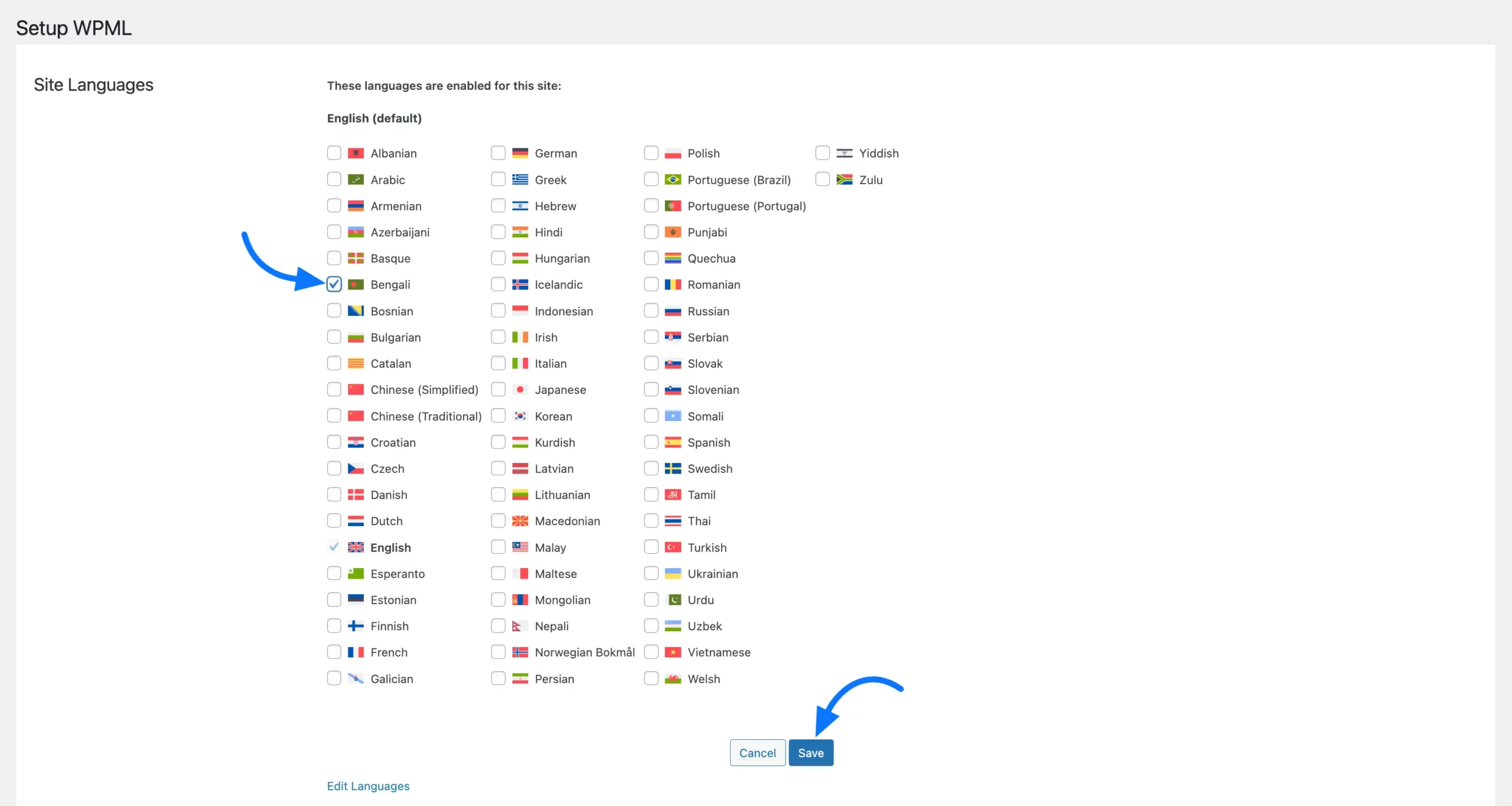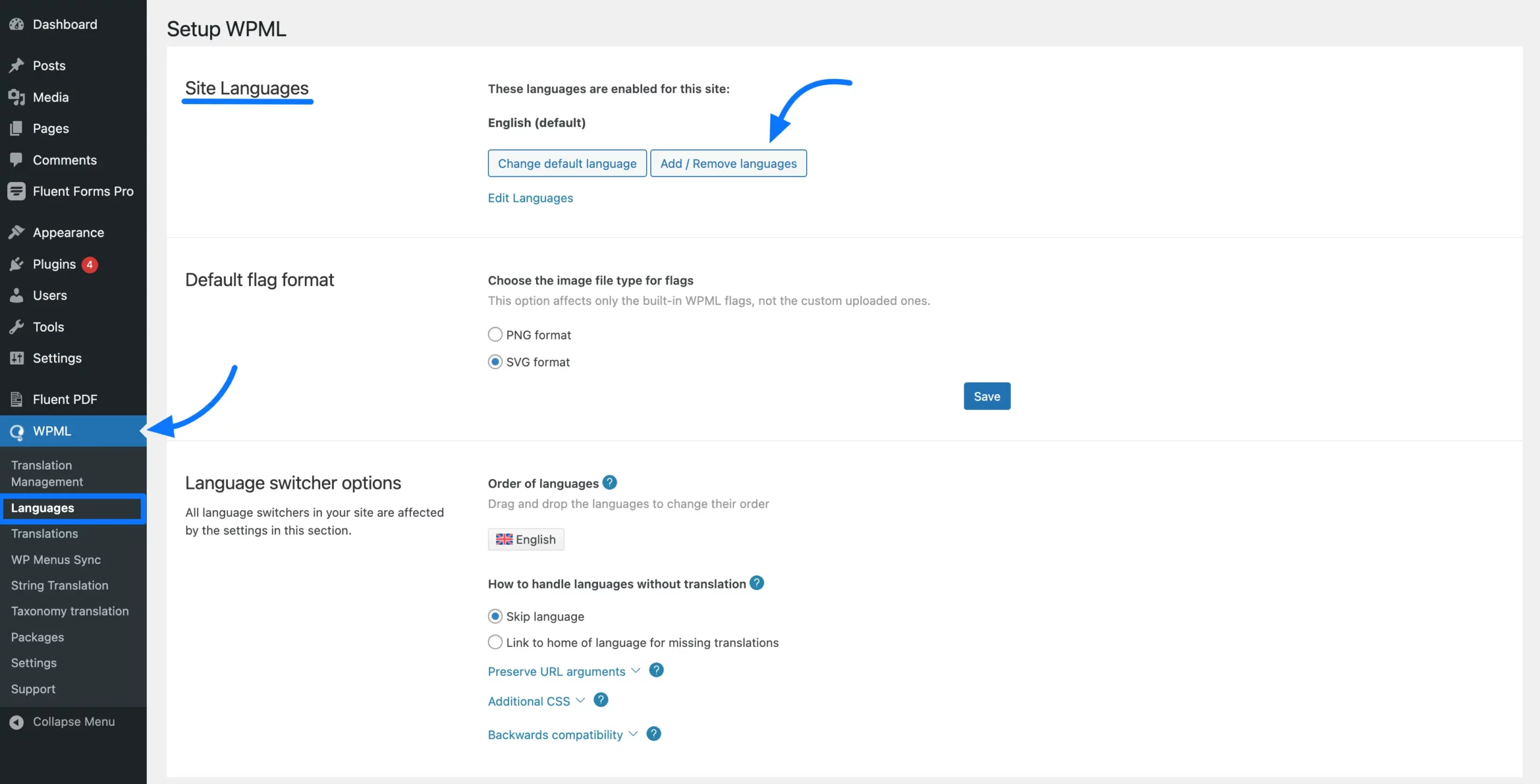 First, go to WPML > Languages from the WordPress sidebar. Under the Site Language Settings, click on Add/Remove Languages and choose the language(s) you want to use for translating your form.