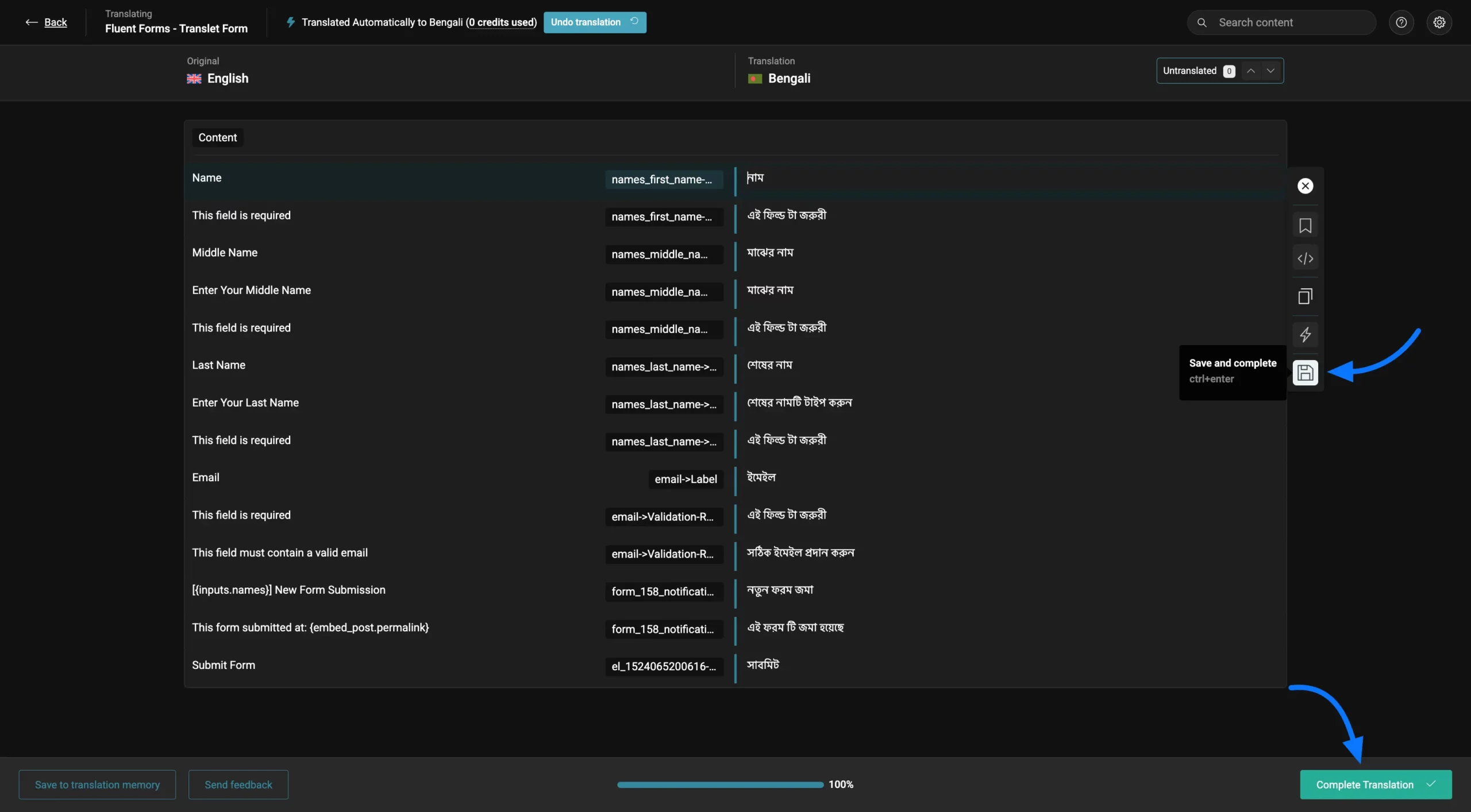 Once all fields are translated, the progress bar will reach 100%. Now, click the Complete Translation button to finish the translation.