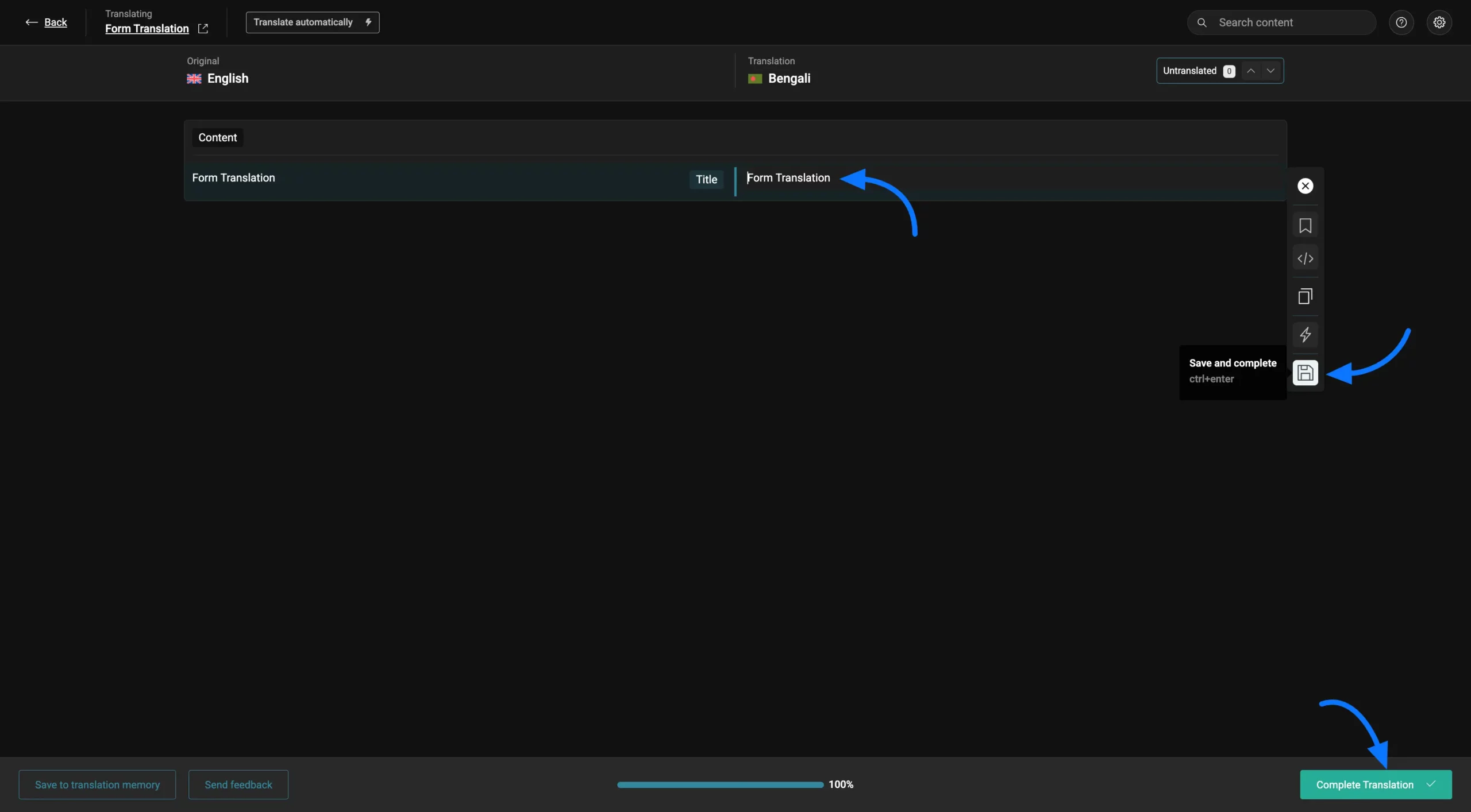 If you’ve finished translating the page, click the Complete Translation button to finalize.