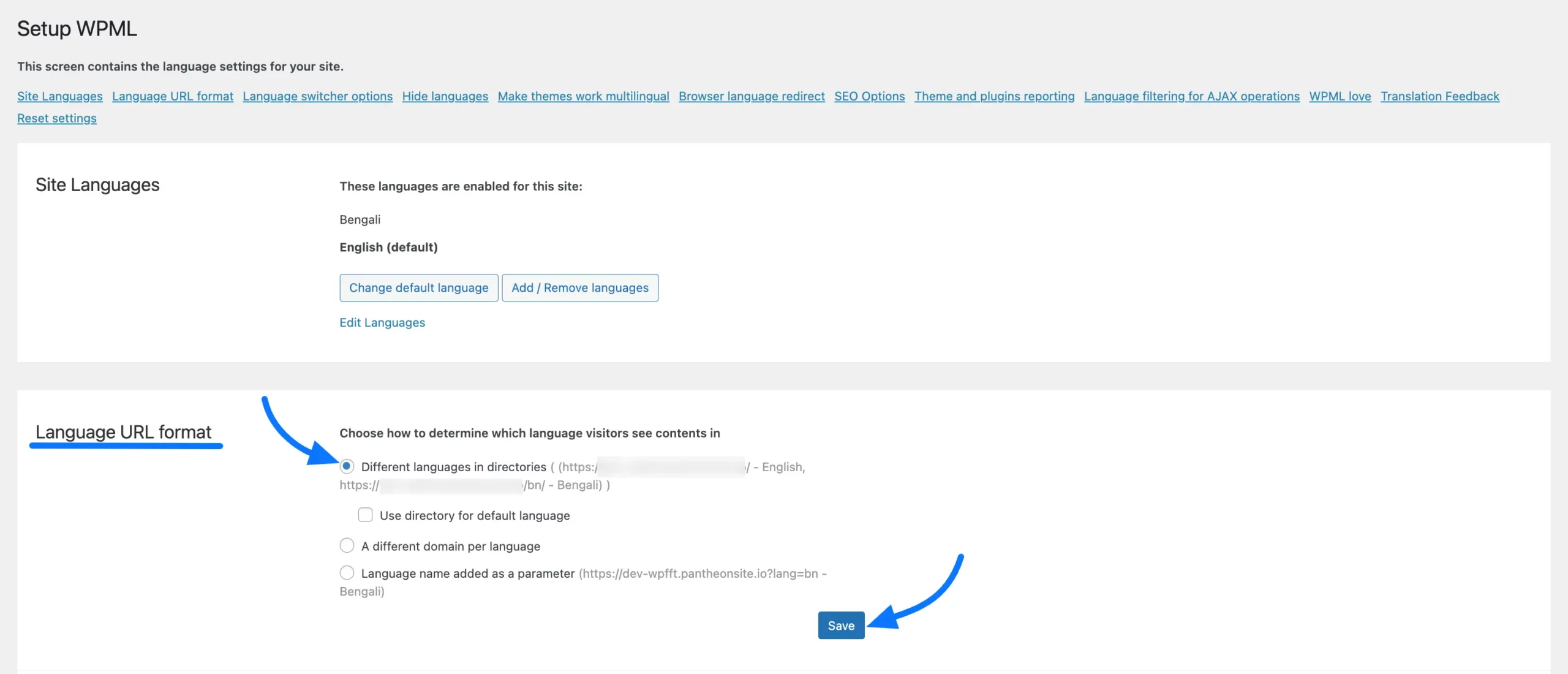 Next, you’ll see the Language URL format settings. From here, choose the Different languages in directories option and click Save to apply the changes.