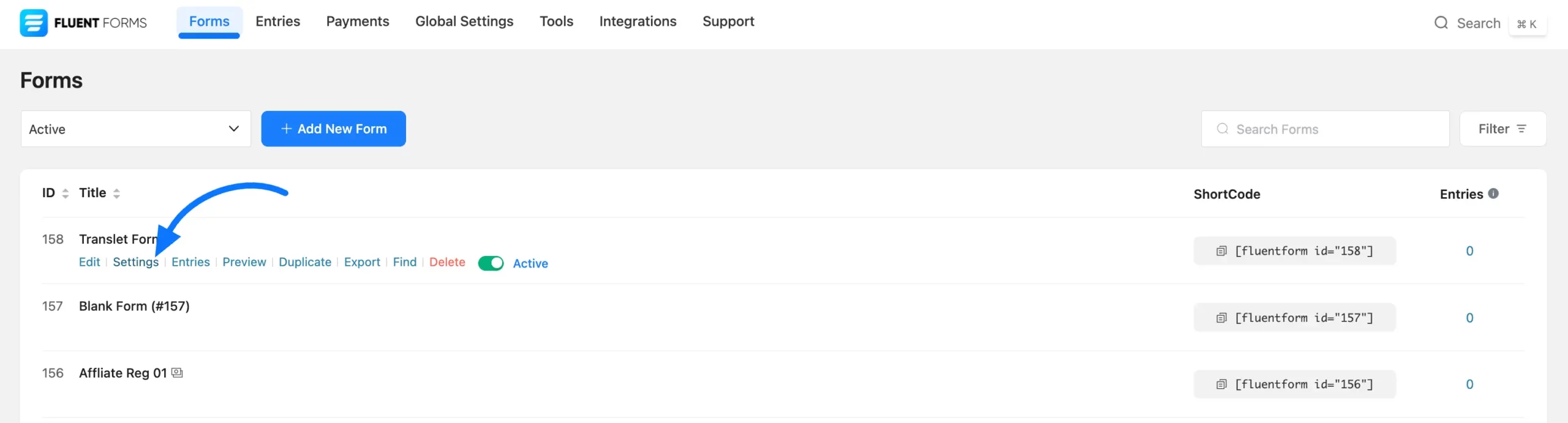 To enable translation for a specific form, first go to Forms from the Fluent Forms navbar. Then, open the Settings of the form you want to translate.