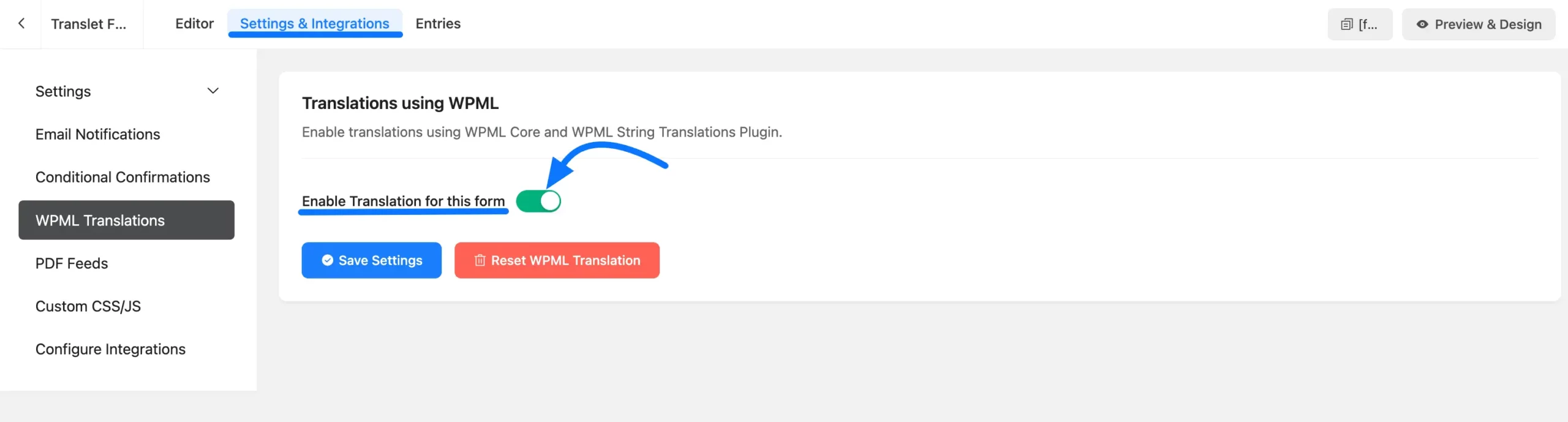 When you’re in the form’s settings, click on WPML Translations from the left sidebar. Then, toggle on the Enable Translation for this Form option and hit the Save Settings button.