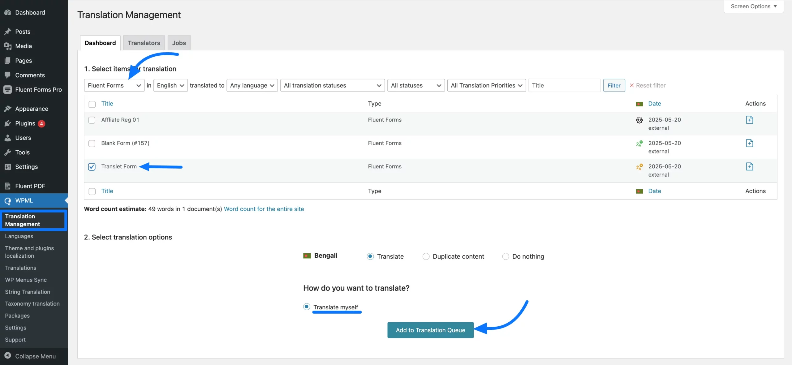 Start translating your form into another language, go to WPML > Translation Management from the WordPress sidebar. Here, you’ll see a list of translatable pages, posts, and other content.