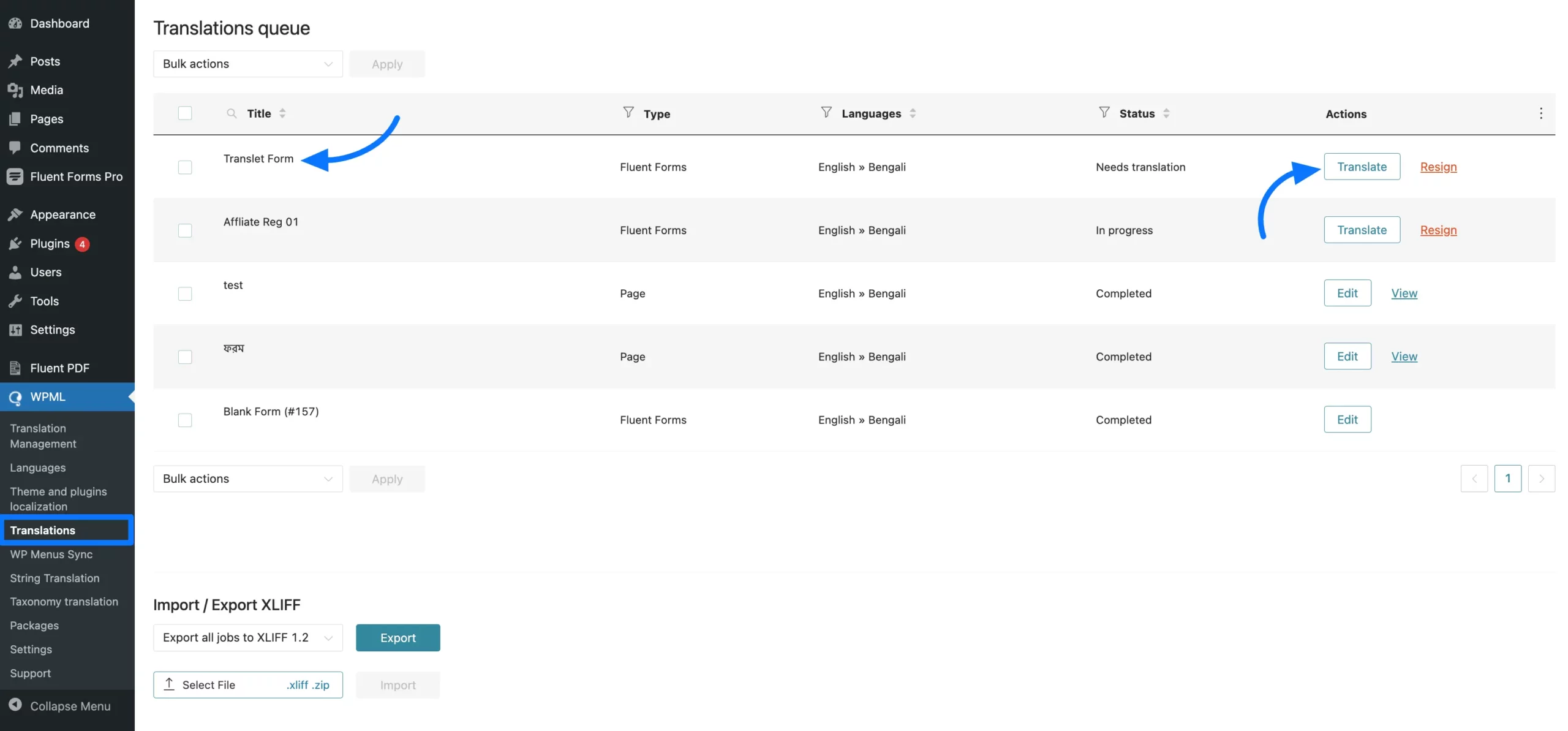 To access the Translation Queue, navigate to WPML > Translations from the WordPress sidebar. Here, you’ll find the form you previously added to the queue. Click the Translate button next to the form to begin translating it.