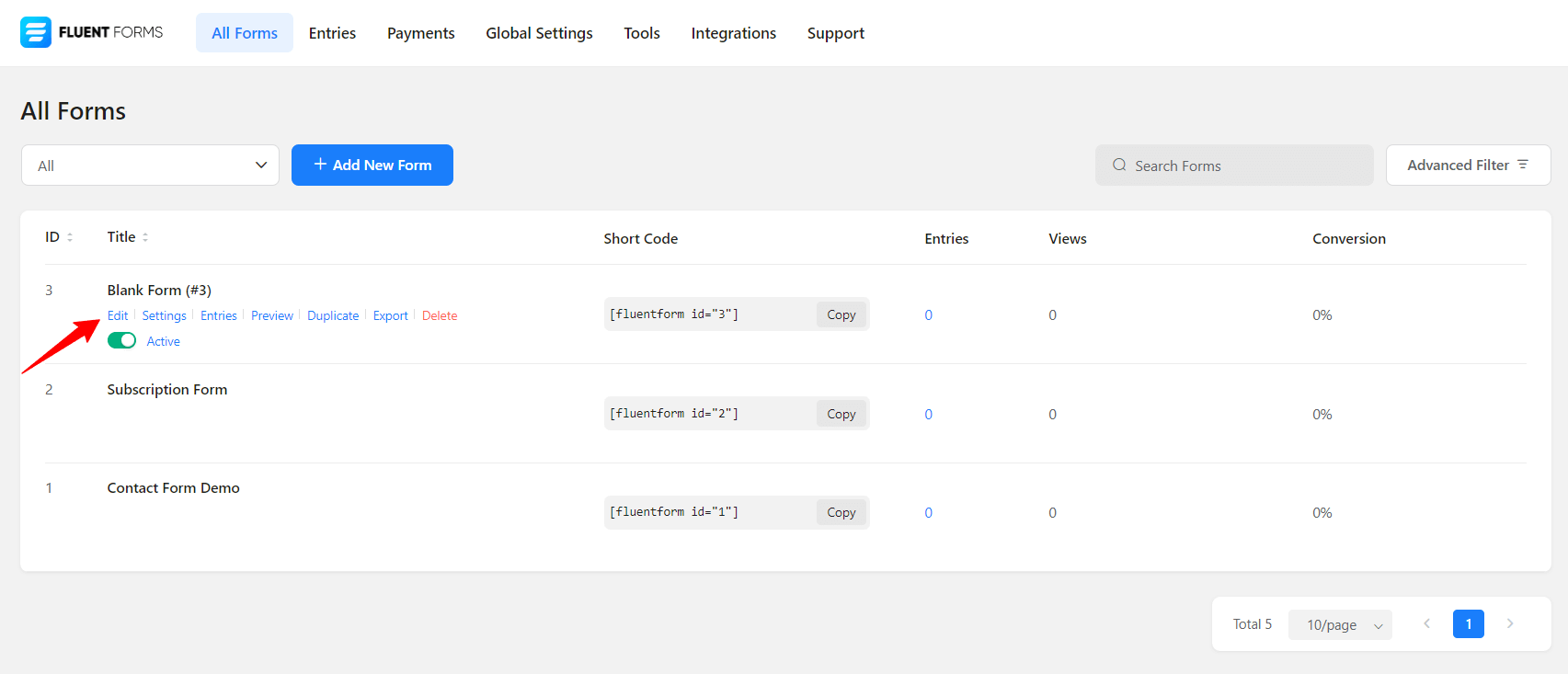You can access the Editor of the Fluent forms by going to all forms and selecting the Edit option of any individual form, as shown in the screenshot below.
