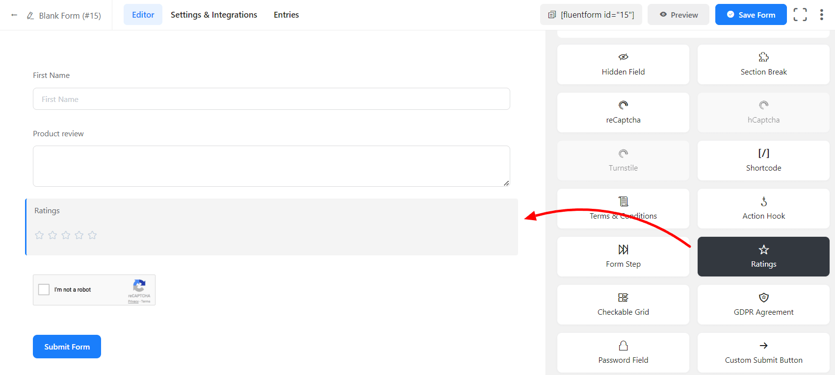 - To add this field to your form, drag and drop the Ratings field from the available Advanced input fields.