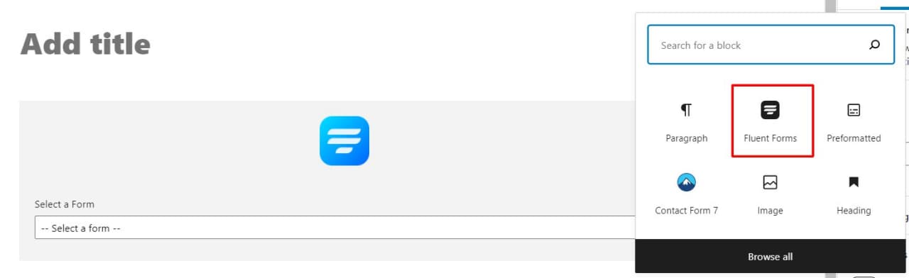 If you are creating any page or posts with Gutenburg, click on the Add Block icon (+) and then select the Fluent Forms block, which can be found within the Formatting section, or by using the search feature.