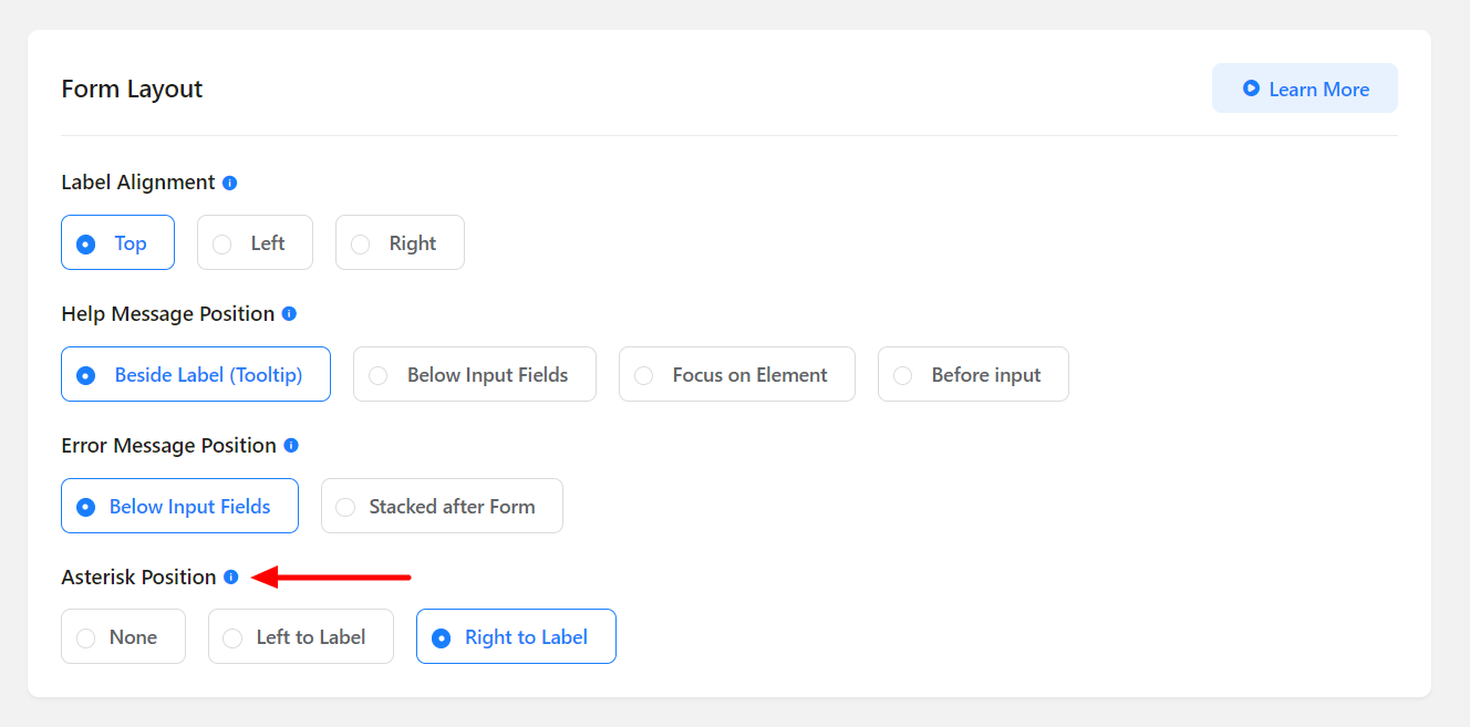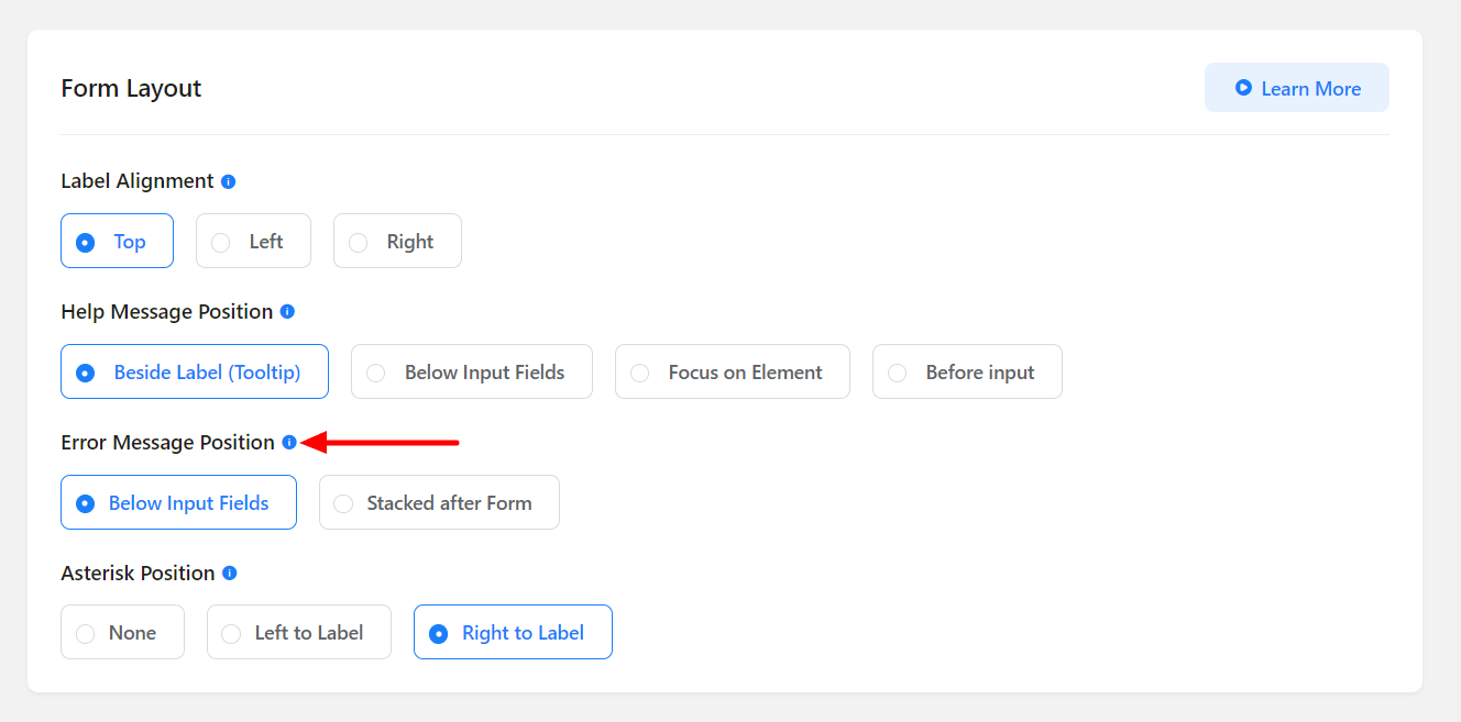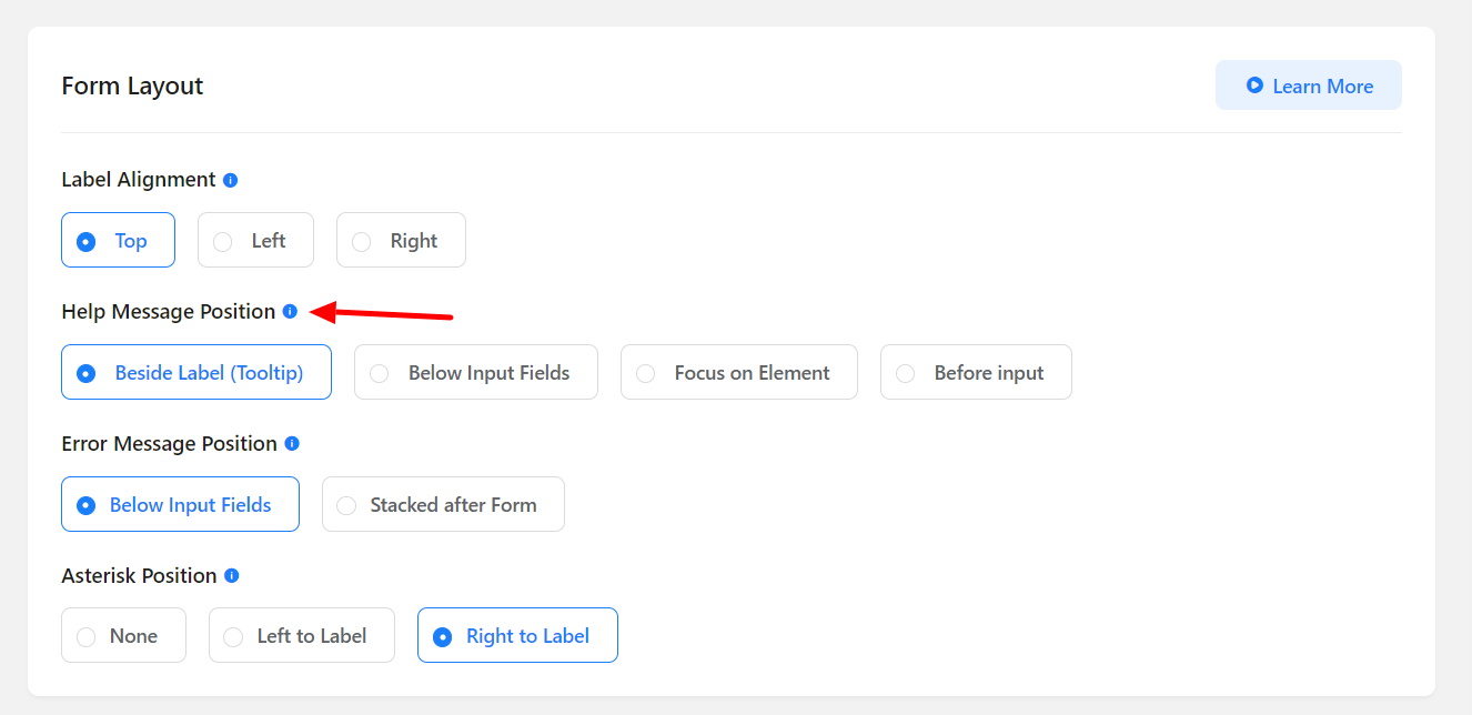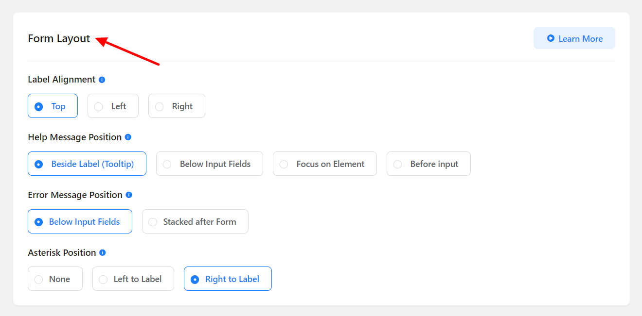 Fluent Forms has a powerful layout setting. The basic customizations of how your form looks can be set from this option. The position of the input field label alignment, help message placement, and error message placement can be defined from Form Layout Settings.