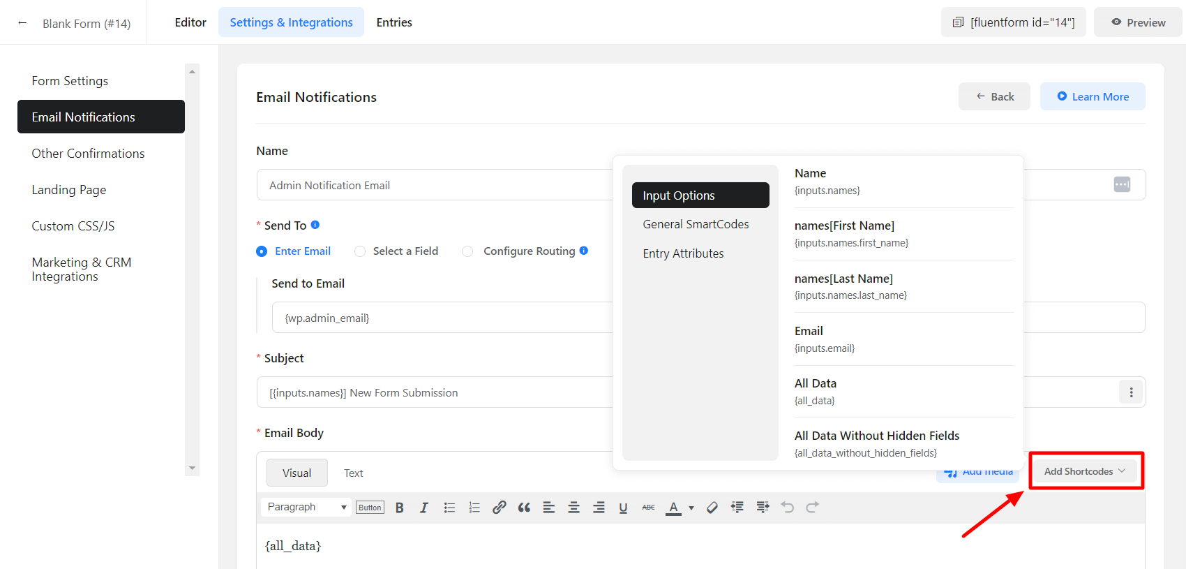 - Configure the Subject & Message that is to be sent out to the entries in the following fields. Use the Add Shortcodes drop-down for ease of use. Also, edit the message body in HTML codes in the Text tab for advanced customization.