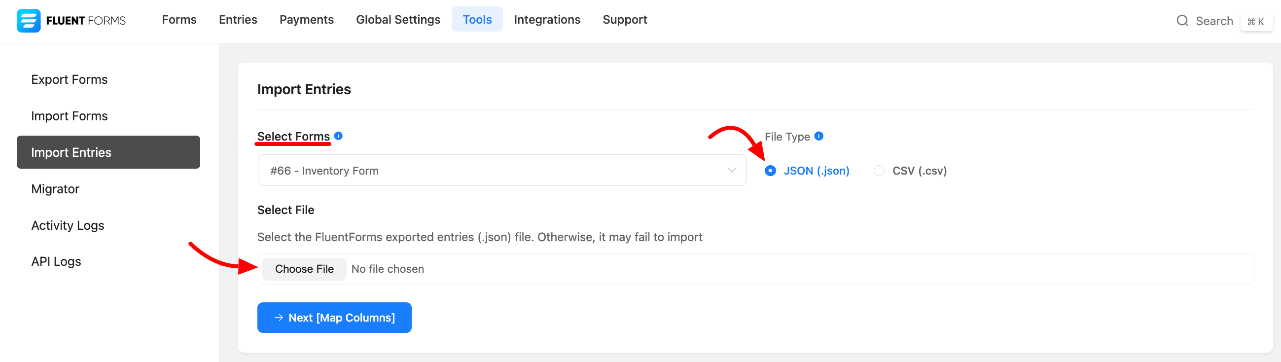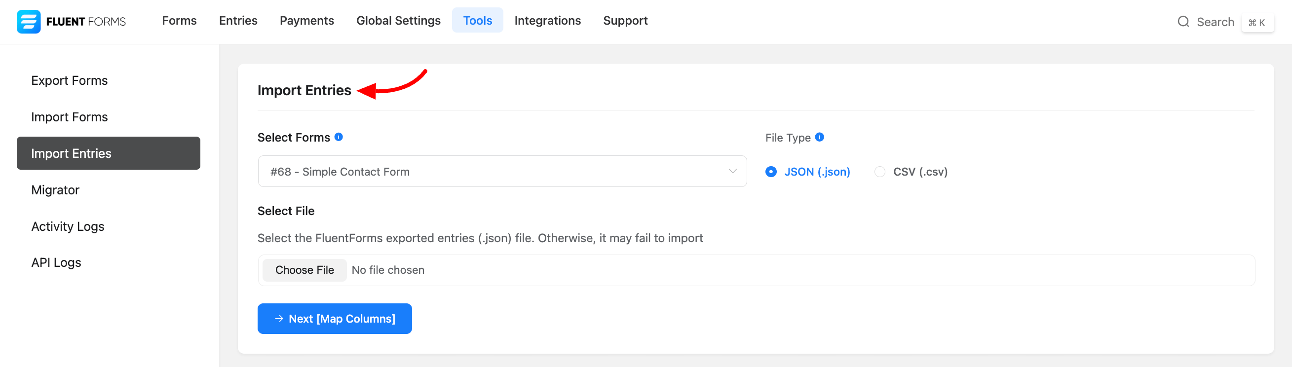 To initiate the import process, go to Fluent Forms>Tools and select Import Entries. This action will unveil the entries import options for you. You can also import from individually form entries page.