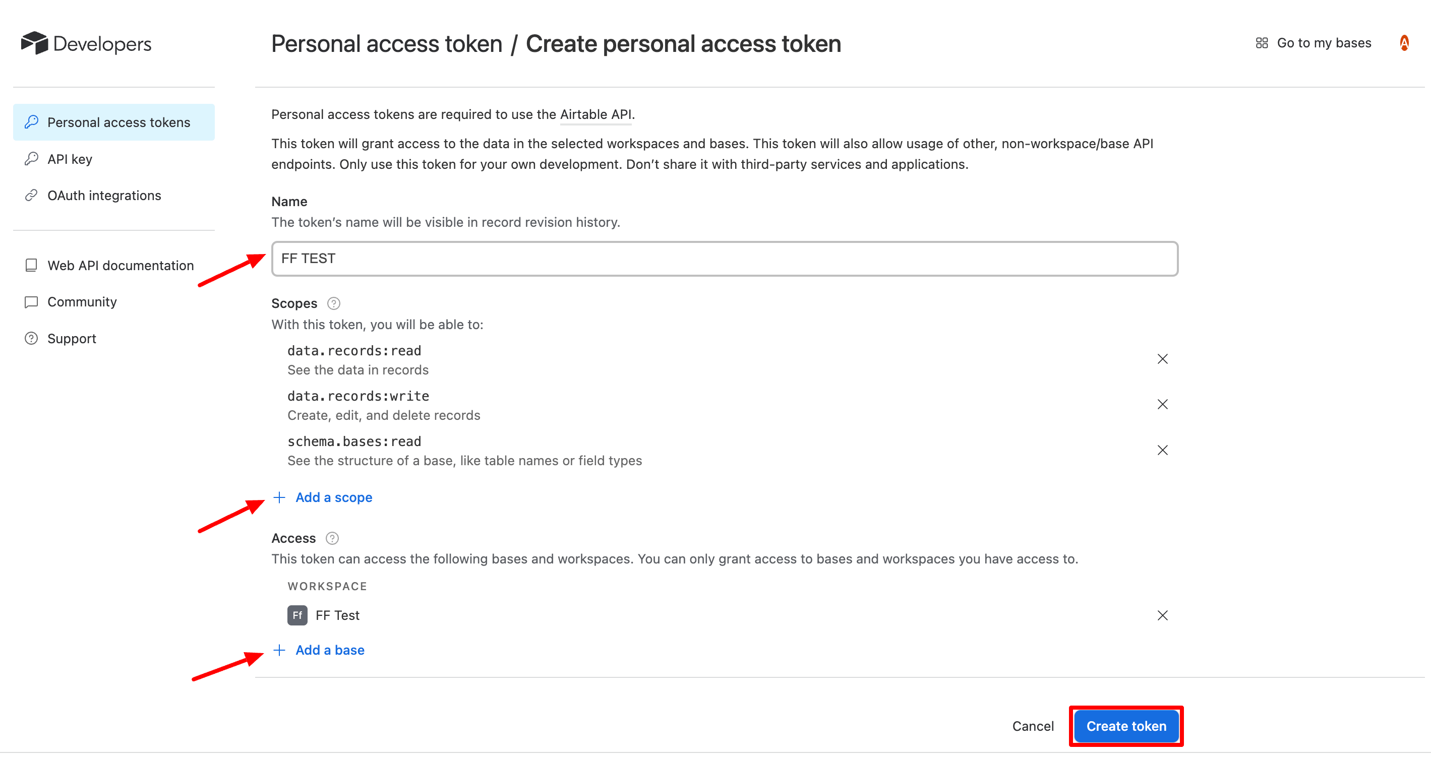 Now here you have to give a token name. Then, add the following scopes (data.records:read, data.records:write, schema.bases:read). Now select the workspace you want to add from the Access section. Click on the Add Base button and select your workspace.