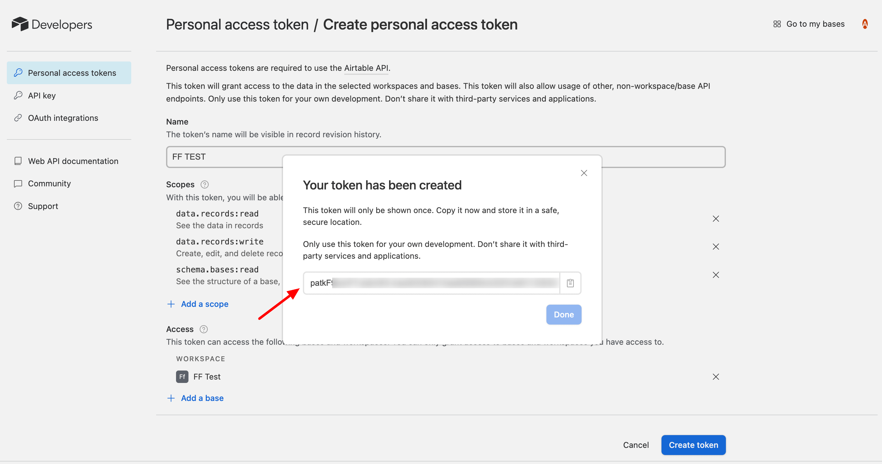 - Copy the new access token and paste it to the Airtable settings of your Fluent Form