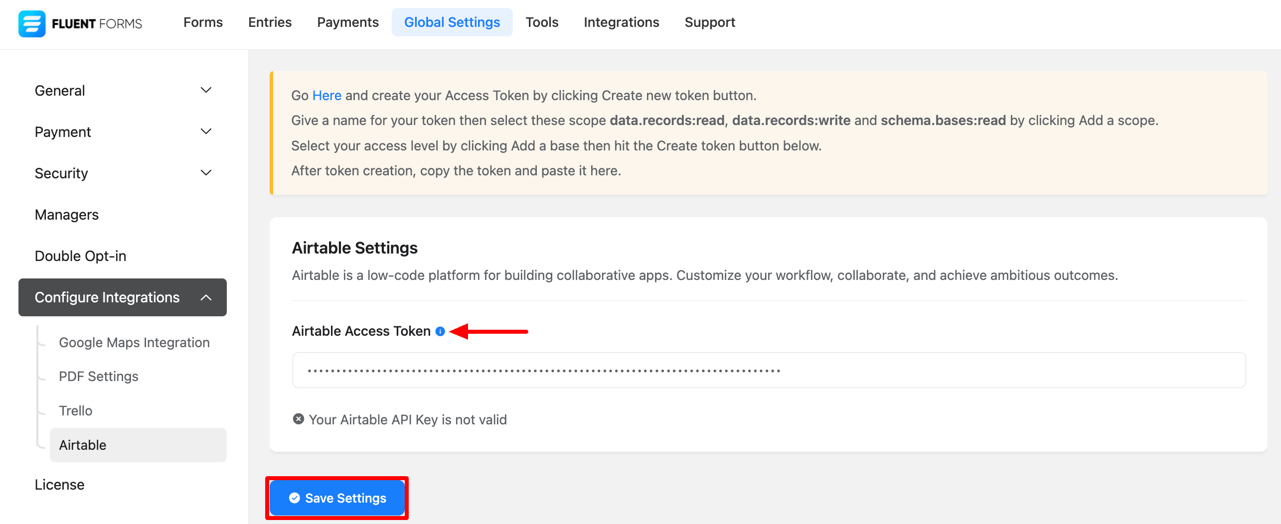 Configure Airtable Access Token with Fluent Form Pro
