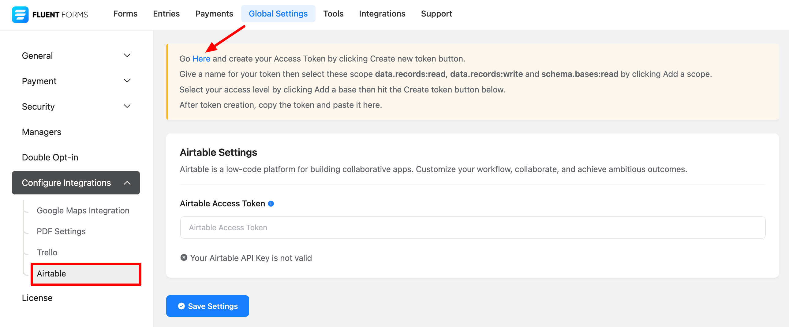 You can also open the Airtable Settings From Global Settings > Configure Integrations > Airtable and you will find the Airtable Settings. Here you need an Airtable Access Token to integrate with the Fluent Form Pro. For an access token go to your Airtable account by clicking on “here”.