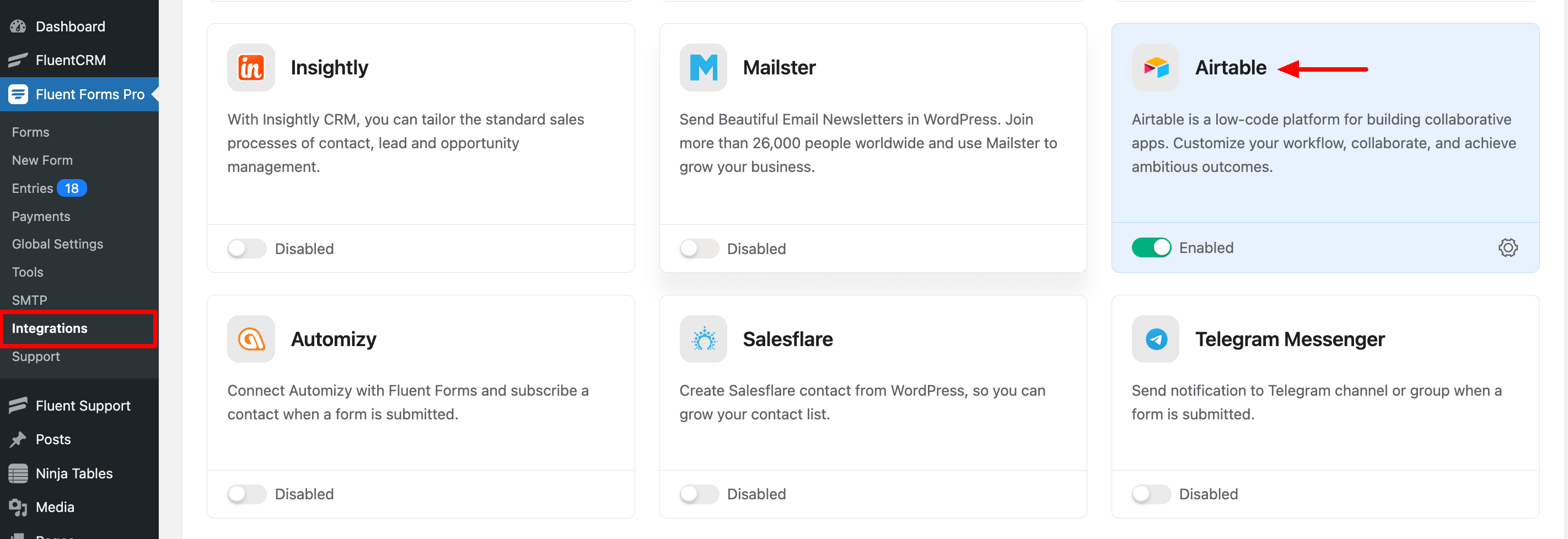 First, go to the Fluent Form Pro Integration and find the Airtable Module and enable it now go to the settings of Airtable. You can go to the Airtable setting by clicking on the settings Icon in the corner of the Airtable Module.