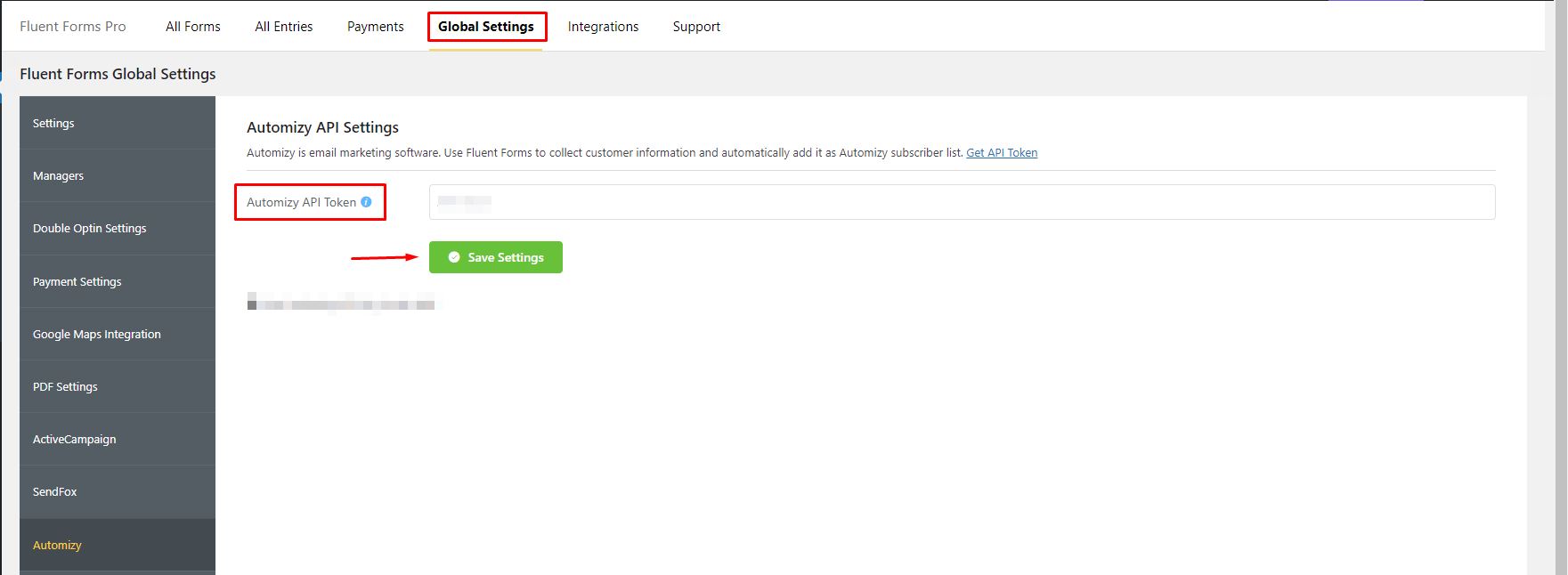 - Now Paste it Automizy Global Settings tab in Fluent Forms & Save Settings.