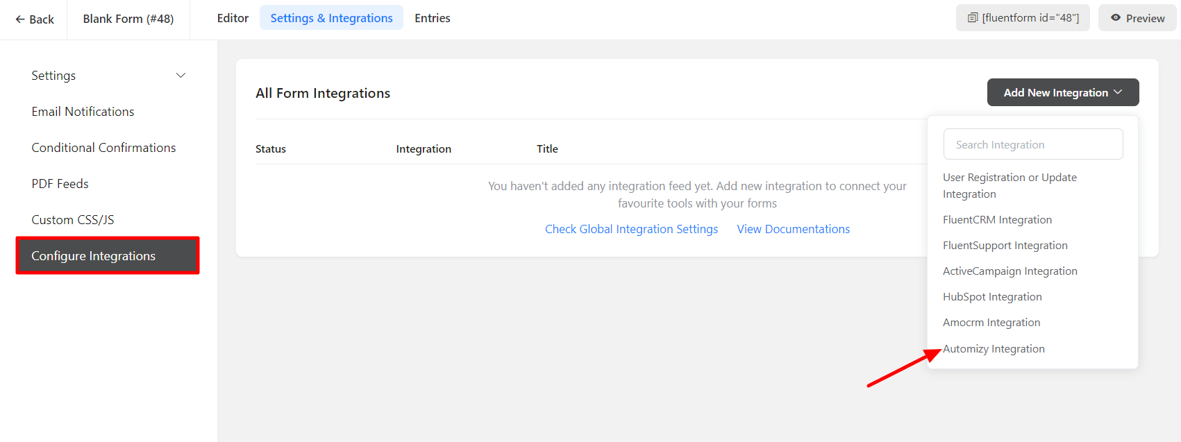 - Now go to the particular form’s settings for the entries you want to be listed in Automizy. Click on Add New Integration and select Automizy Integration from the dropdown.