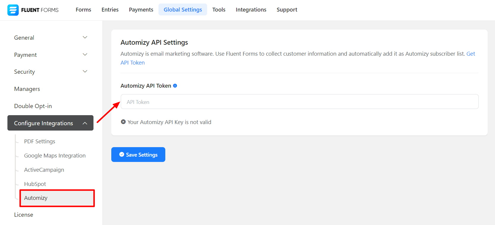 - Again hover over Fluent Forms Pro and go to Settings. Select Automizy, and you will be asked for the Automizy API Token here.