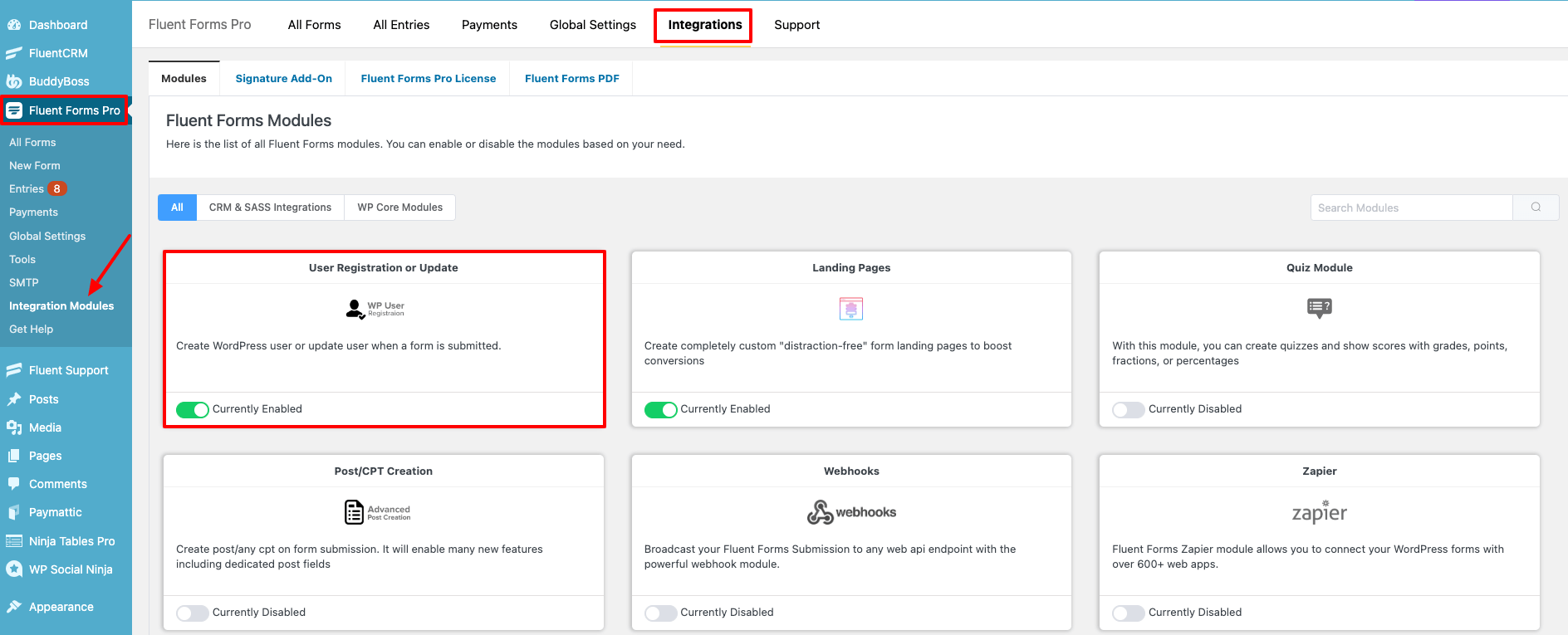 - First, go to the Integration Modules from Fluent Forms (WordPress admin panel sidebar) and turn on the User Registration or Update Module, as shown in the screenshot below –