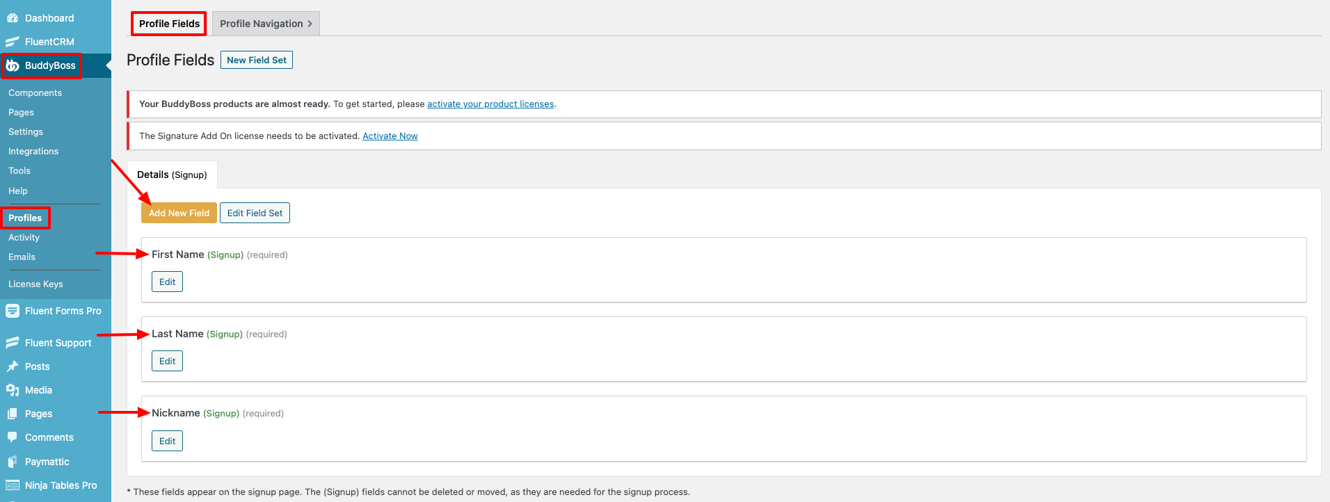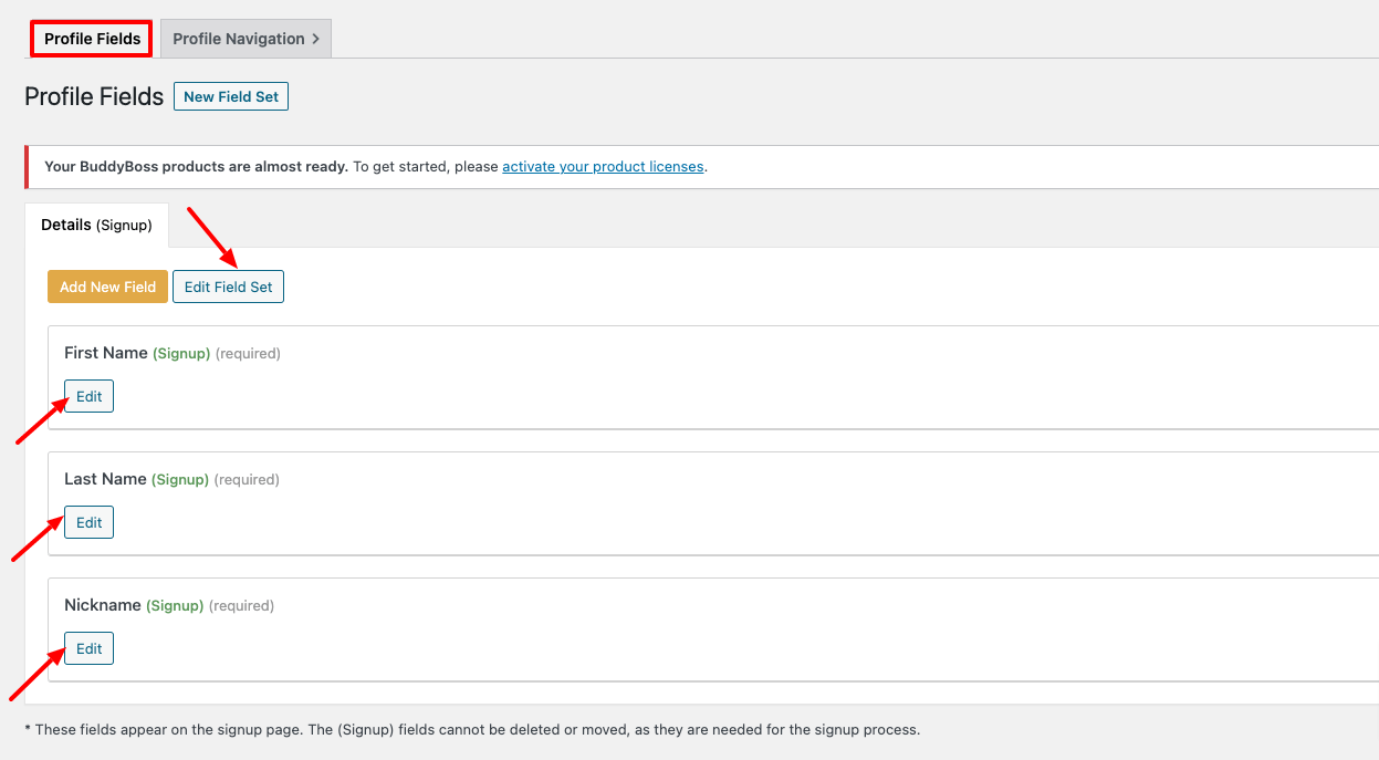 - In Profile Fields, First Name, Last Name & Nickname, you will get this Field Set is initially created.