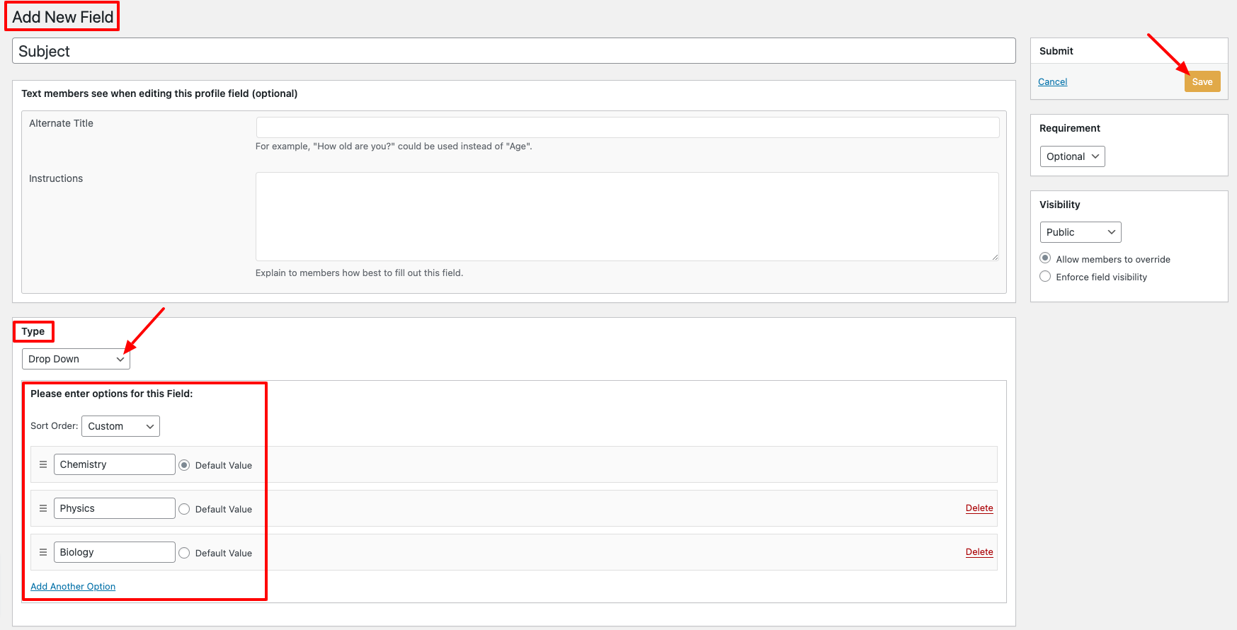 - Here, a new field is added. Where you can choose the Type of the fields, you can also choose the options for that field. Click on the Save button after you’re done with creating the field.