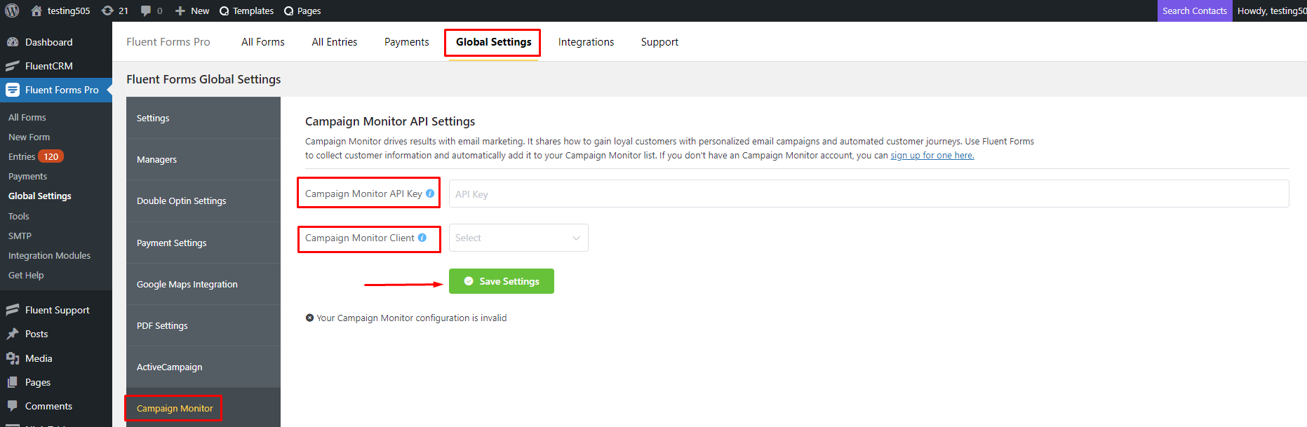 • Again hover over Fluent Forms Pro and go to Settings. Select Campaign Monitor, and you will be asked for the Campaign Monitor API Key and Client ID here.