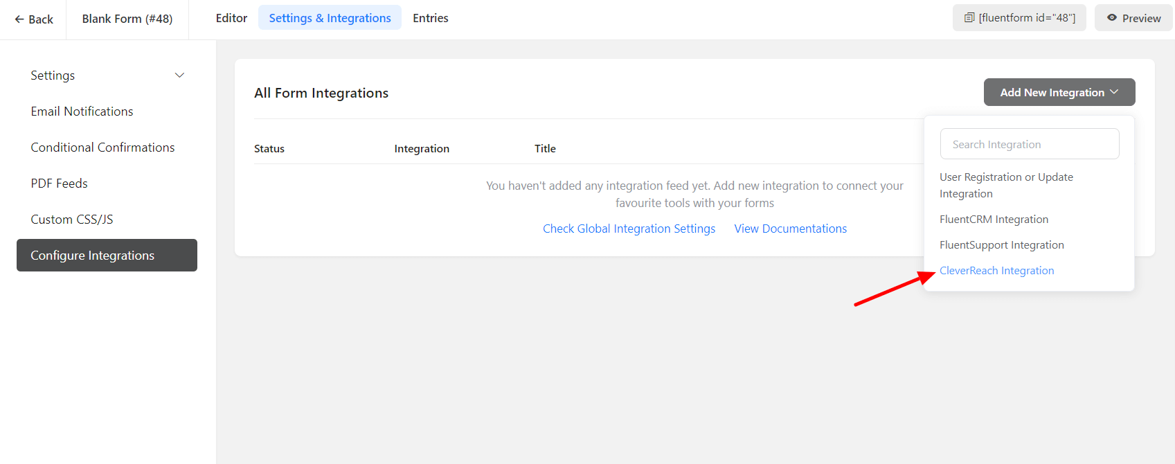 - Now go to the particular form’s settings for the entries you want to be listed in CleverReach. Click on Add New Integration and select CleverReach Integration from the dropdown.