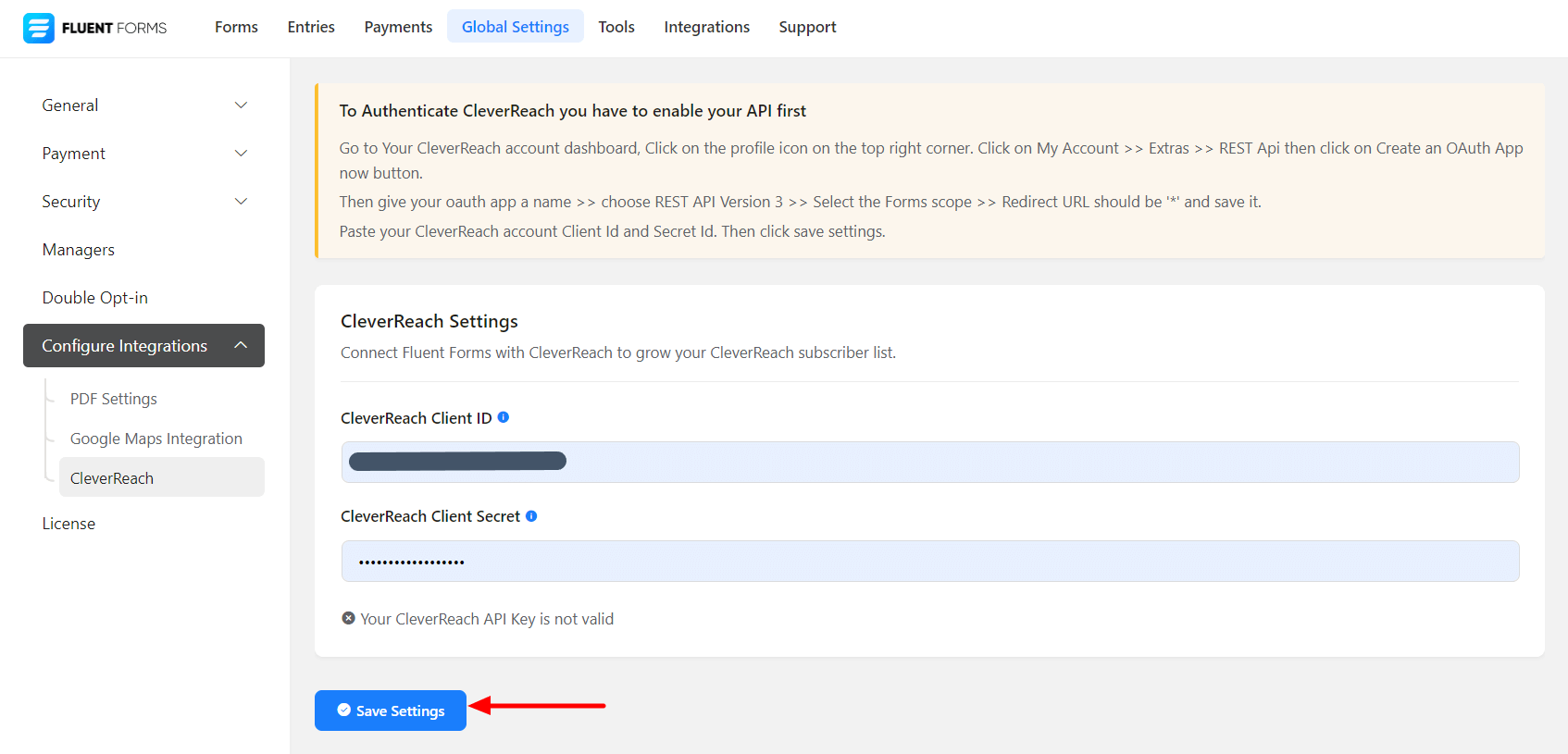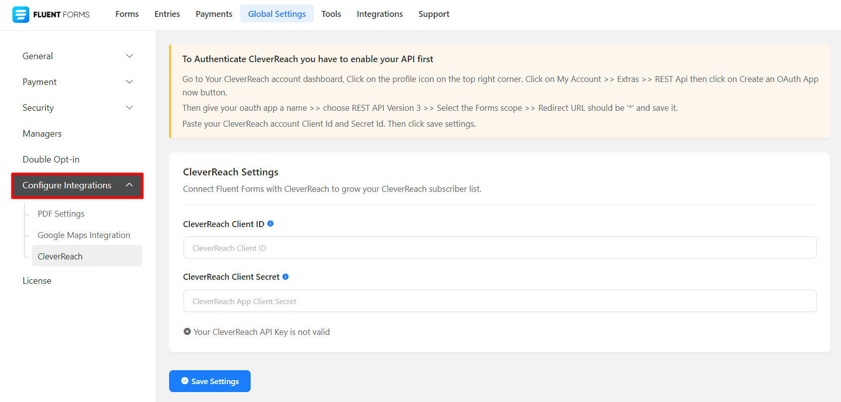 - Again hover over Fluent Forms Pro and go to Settings, as shown in the screenshot below. Select CleverReach, and you will be asked for the CleverReach Client ID and Client Secret.
