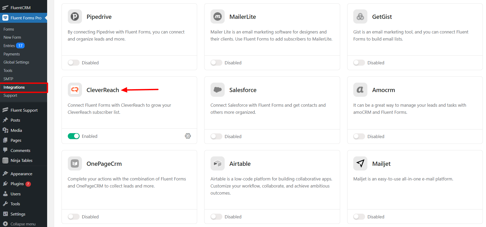 - Go to the Integrations Modules from Fluent Forms (WordPress admin panel sidebar) and turn on the CleverReach Module, as shown in the screenshot below–