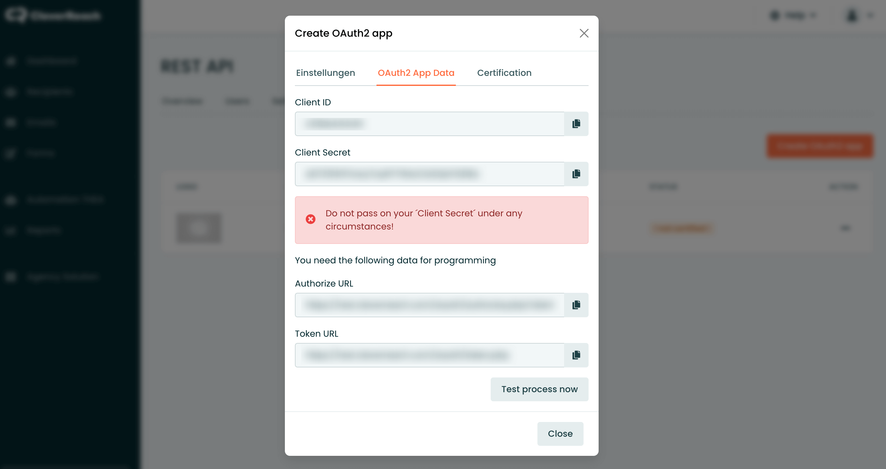 - You will get a Client ID and Client Secret from CleverReach.