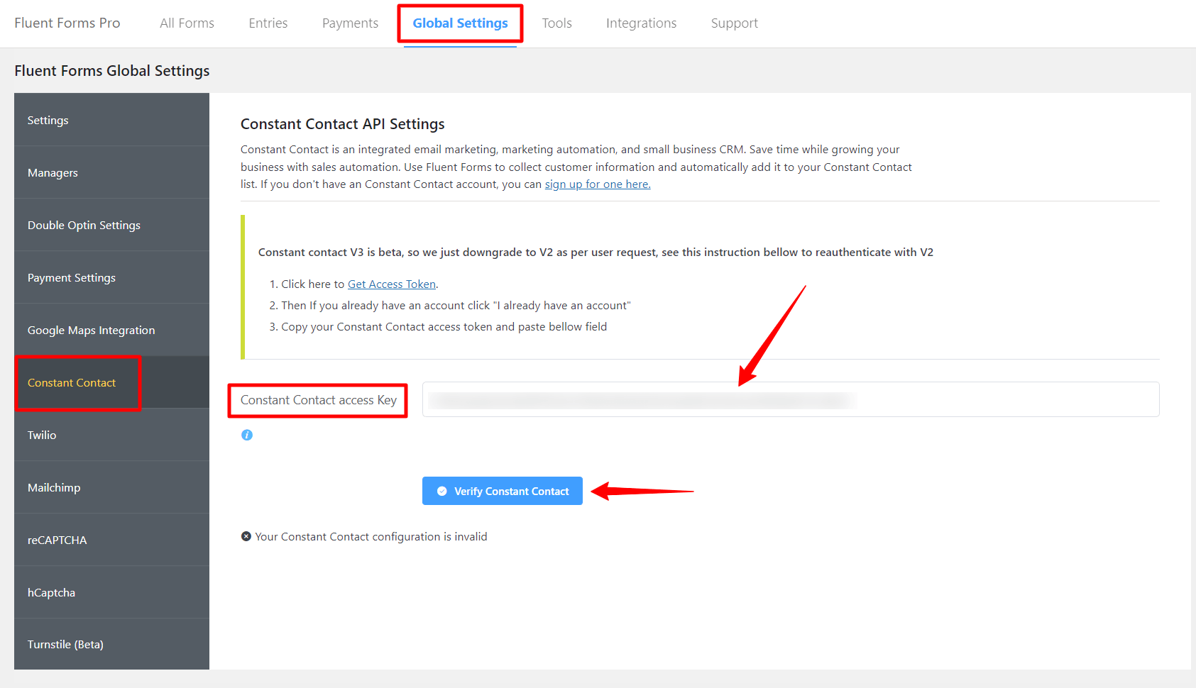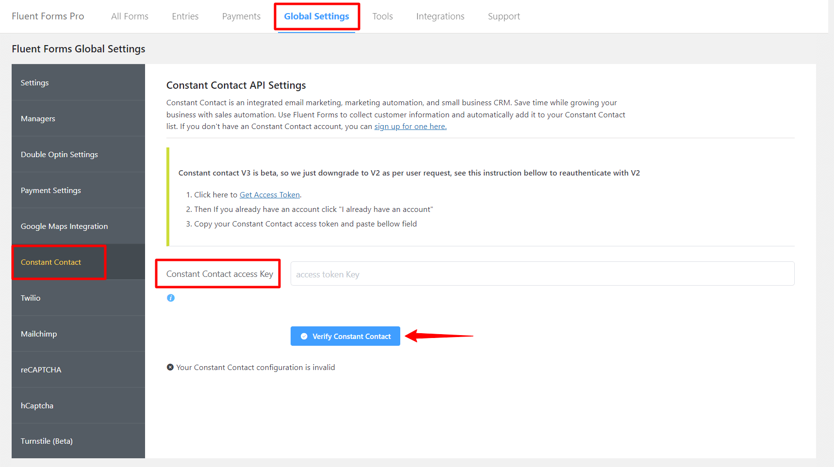 • Again hover over Fluent Forms Pro and go to Settings. Select Constant Contact, and you will be asked for the Constant Contact Access Key here.
