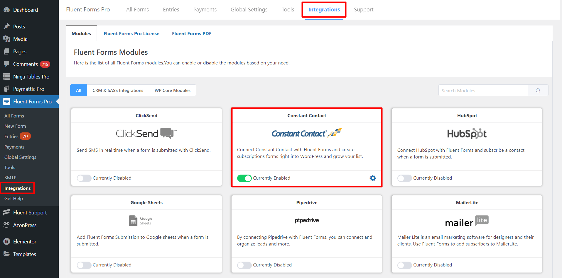 • Go to the Integration Modules from Fluent Forms (WordPress admin panel sidebar) and turn on the ConstantContact Module, as shown in the screenshot below-