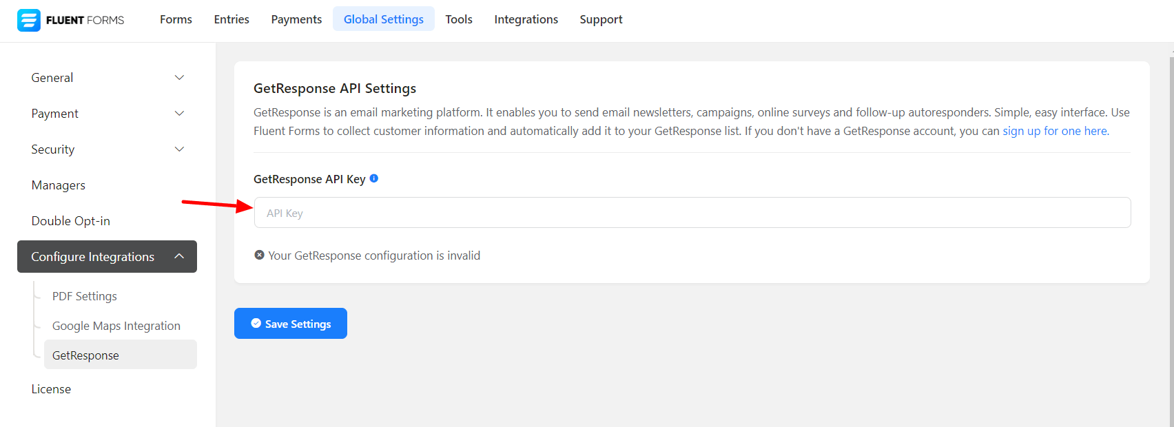 - Again hover over Fluent Forms Pro and go to Settings. Select GetResponse, and you will be asked for the GetResponse API Key here.