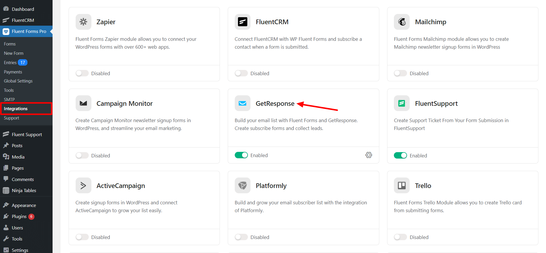 - Go to the Integration Modules from Fluent Forms (WordPress admin panel sidebar) and turn on the GetResponse Module, as shown in the screenshot below-