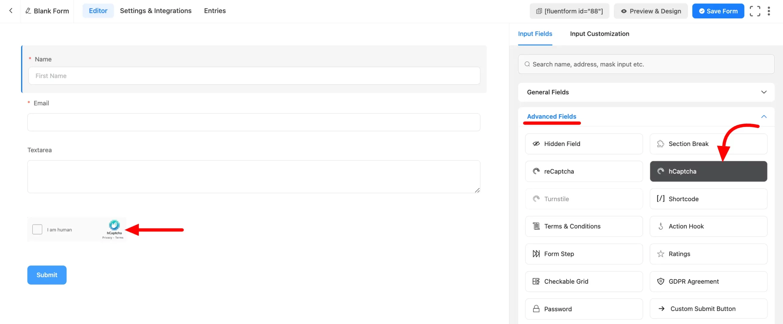 • Then your hCaptcha input field in Fluent Forms will be visible.