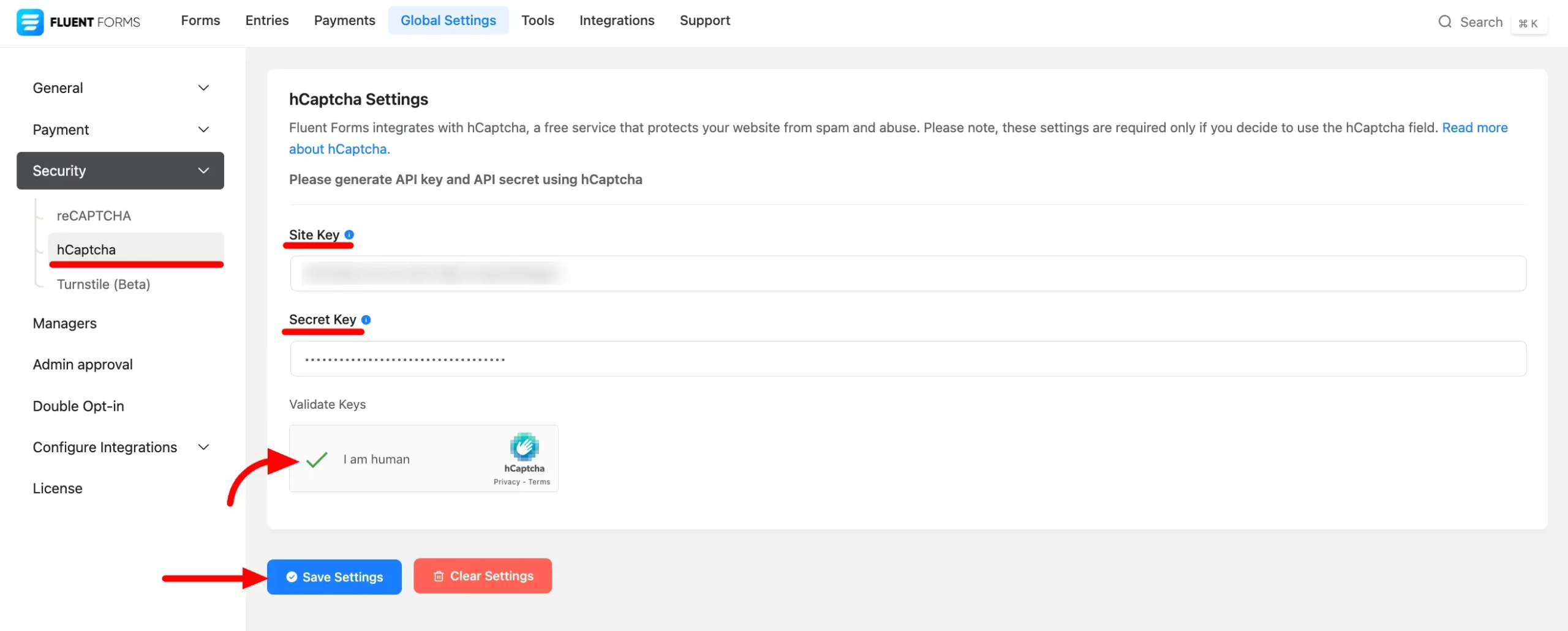 • Paste the Site key and Secret Key to the hCaptcha Settings in Fluent Forms and Click on the Save Settings button.