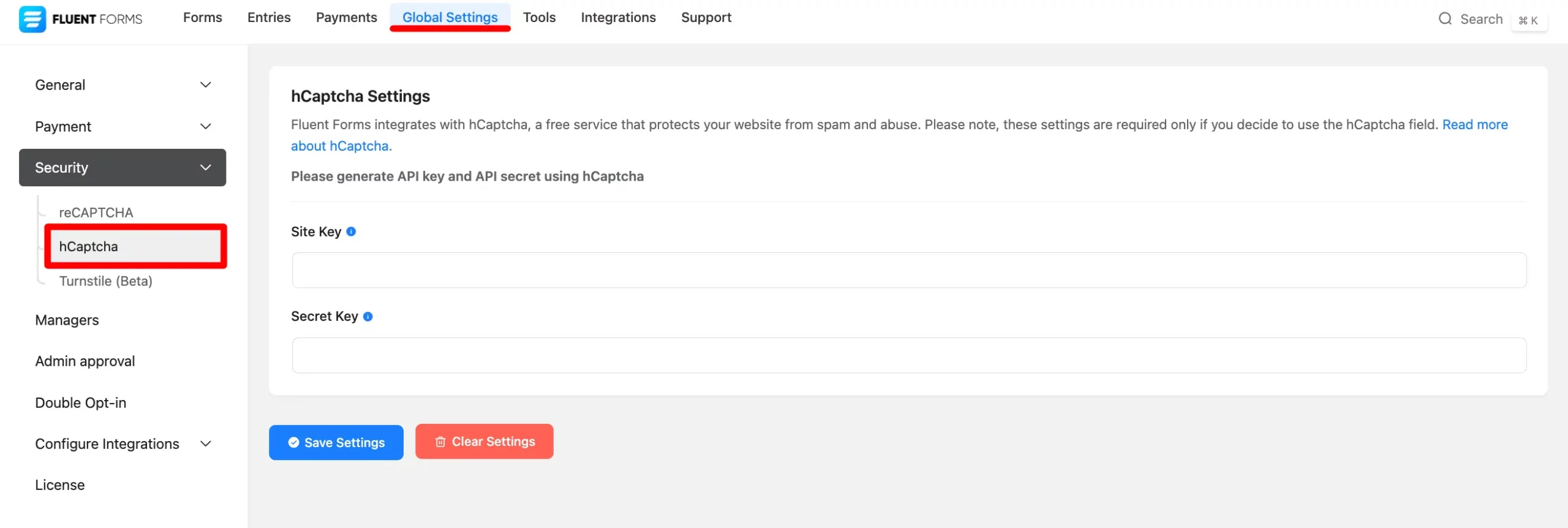 • Go to Global Settings and then select Security from the left sidebar and you will find hCaptcha. Here you will see hCaptcha Settings page.